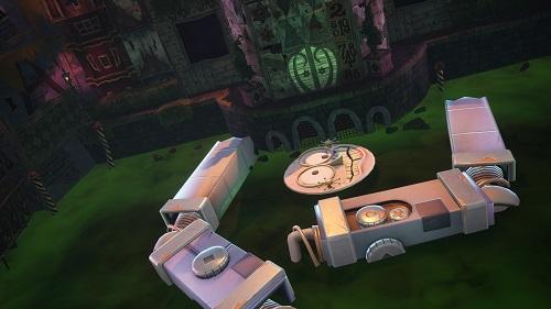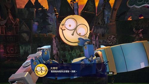 BOSS「瘋狂博士」打法也不一樣,不放電視、鐵塊等,照影片,釋放小精靈付100E票卷幫助,用L1掉下鐵塊打倒場地後方第二個身上有綠色的機器人,這樣開門,再用稀釋劑噴雕像的紅色處,這樣才算稀釋劑打倒。