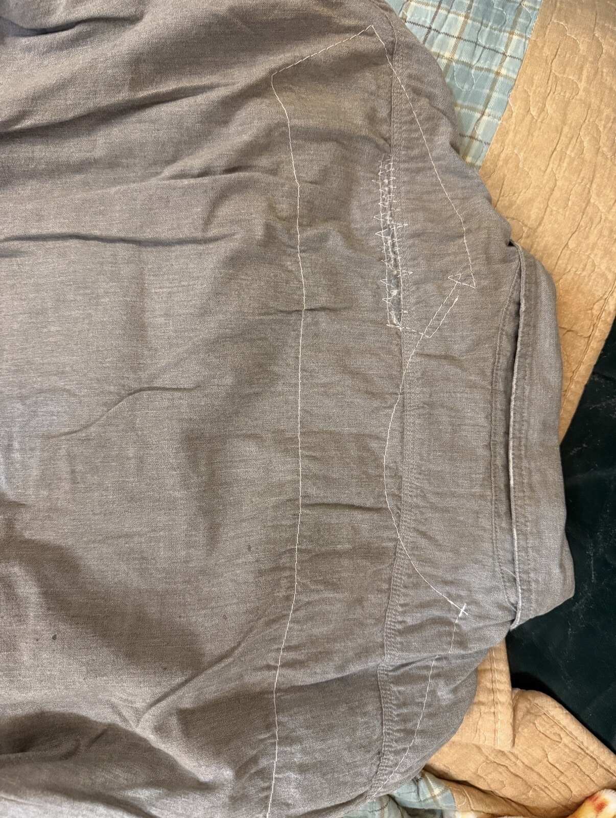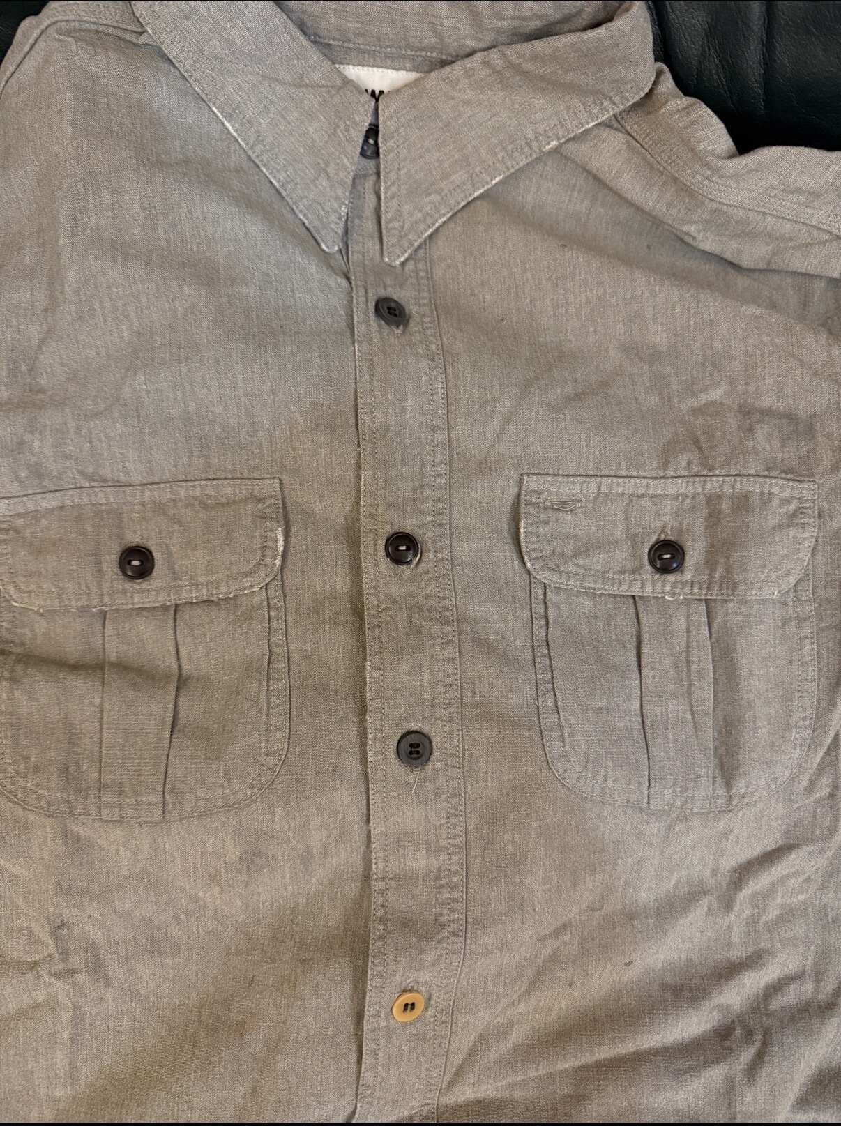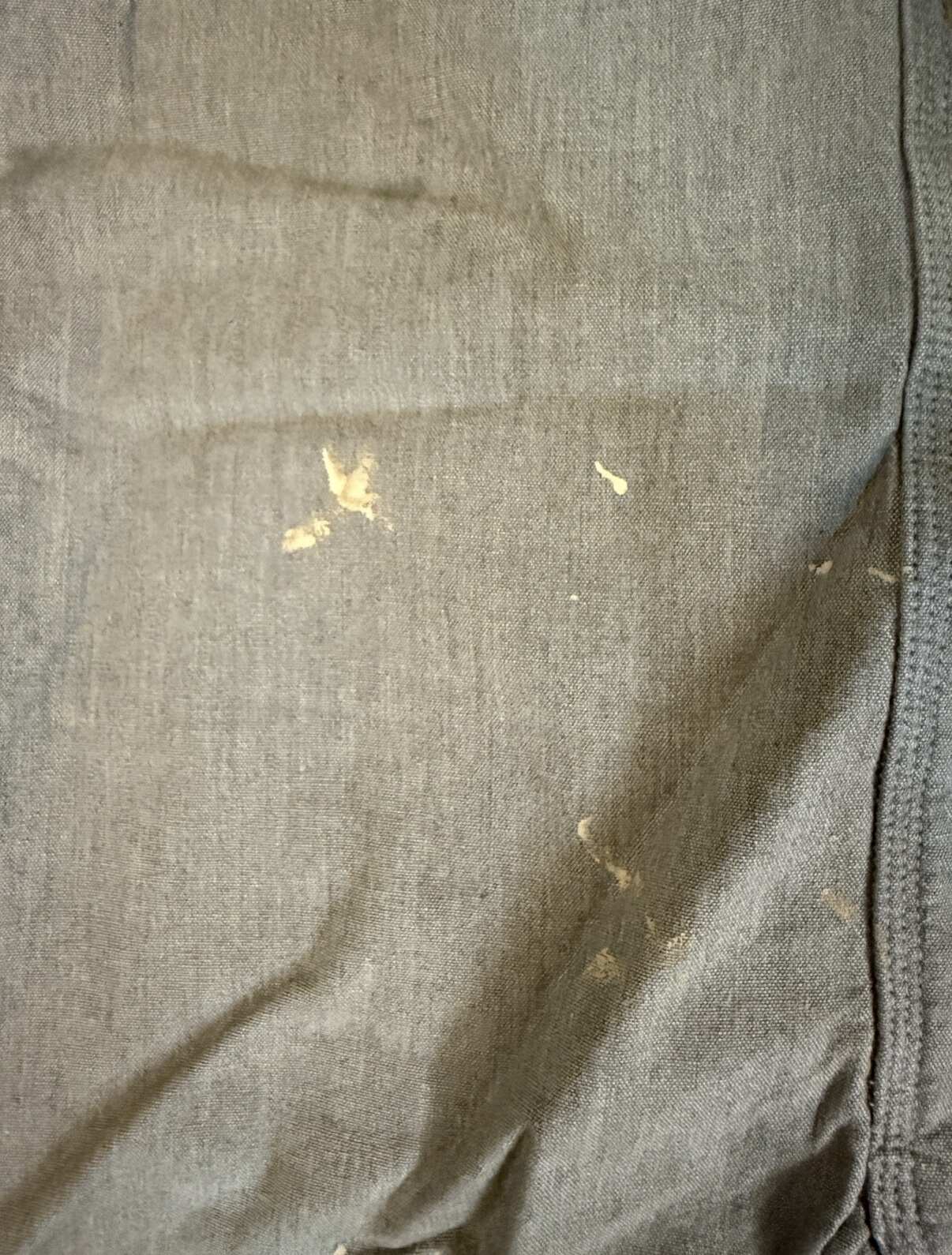 不過不得不說,這件的做舊還是做滿足的,衣擺正面左下角有些面積稍微大一點的白色油漆噴點。領子跟胸前口袋邊緣這些正常使用最容易碰到的地方做了滿自然的磨損做舊。然後他所有門襟的鈕扣都是不一樣的,可能是想仿造是很舊的古著,鈕扣都快換一輪的感覺吧~最後是左後背的磨損補丁,也讓整件衣服前後面都不無聊都有亮點!
