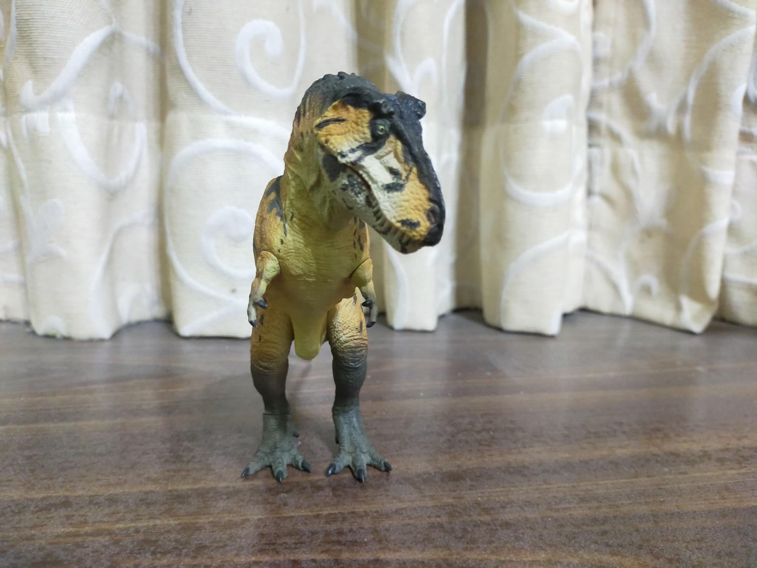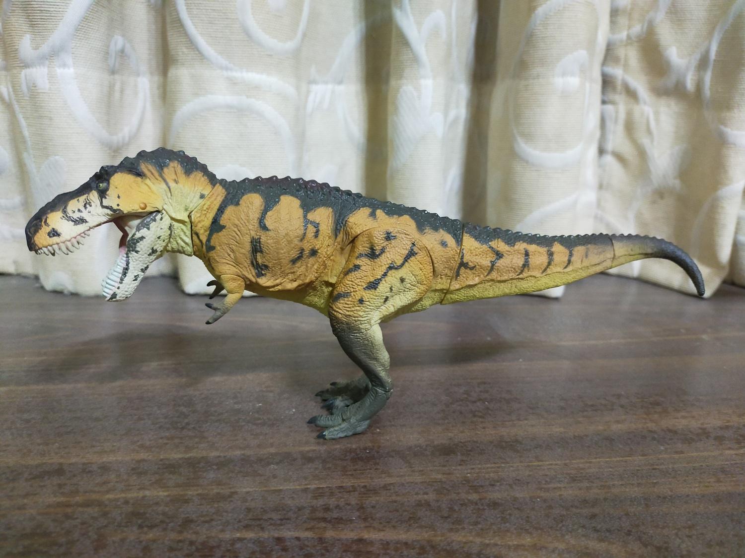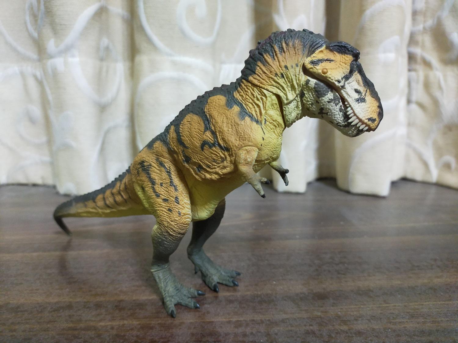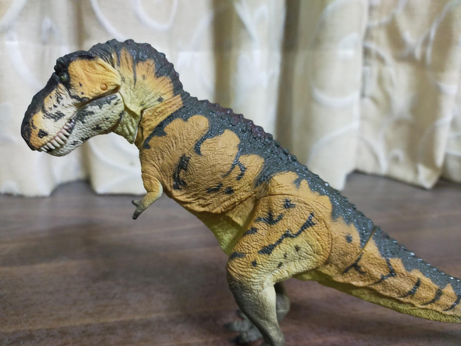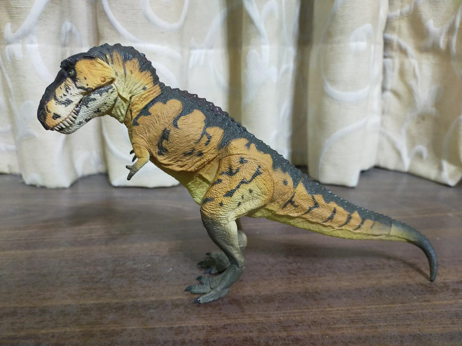 首先是作為普版的虎斑黃。產品貌似沒有標註比例,全長約27cm,半直立高度約15cm。假設這隻的原始尺寸是全長12公尺的成年個體,換算比例會落在大約1:44 Scale的級別
