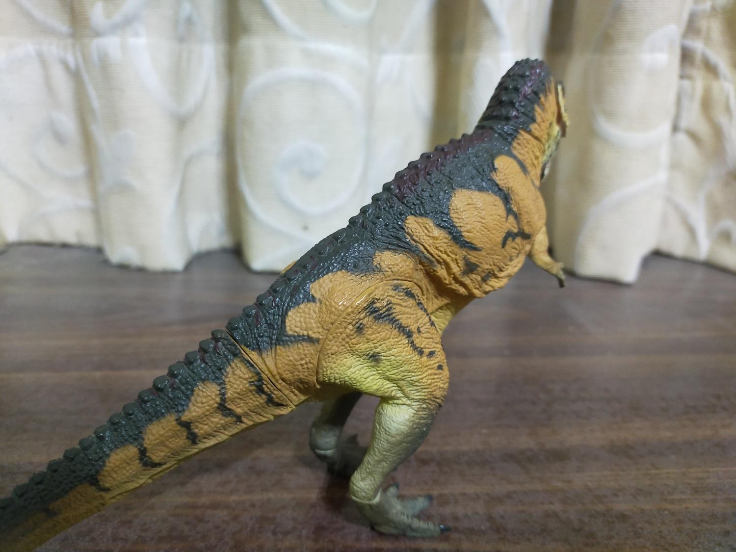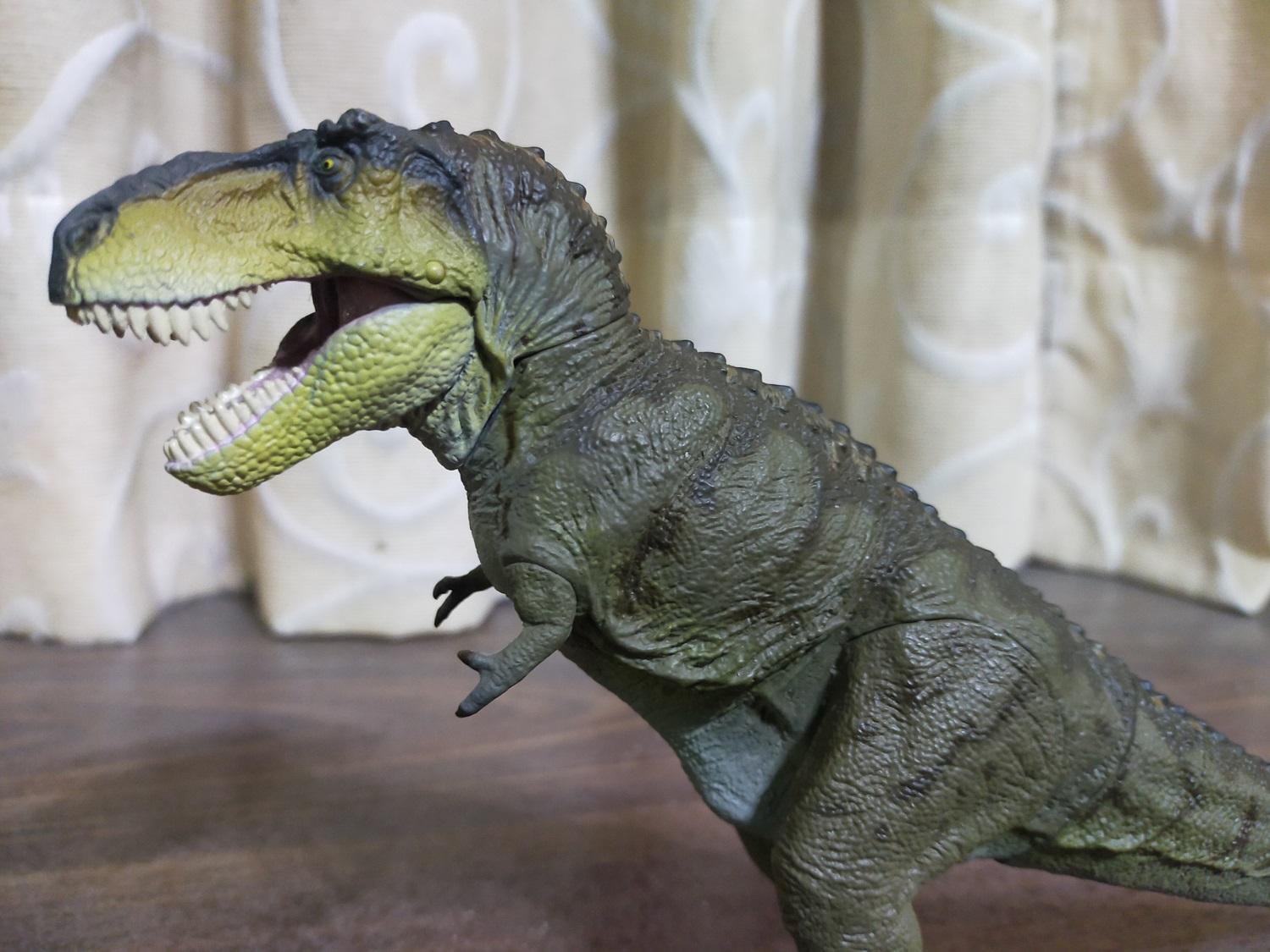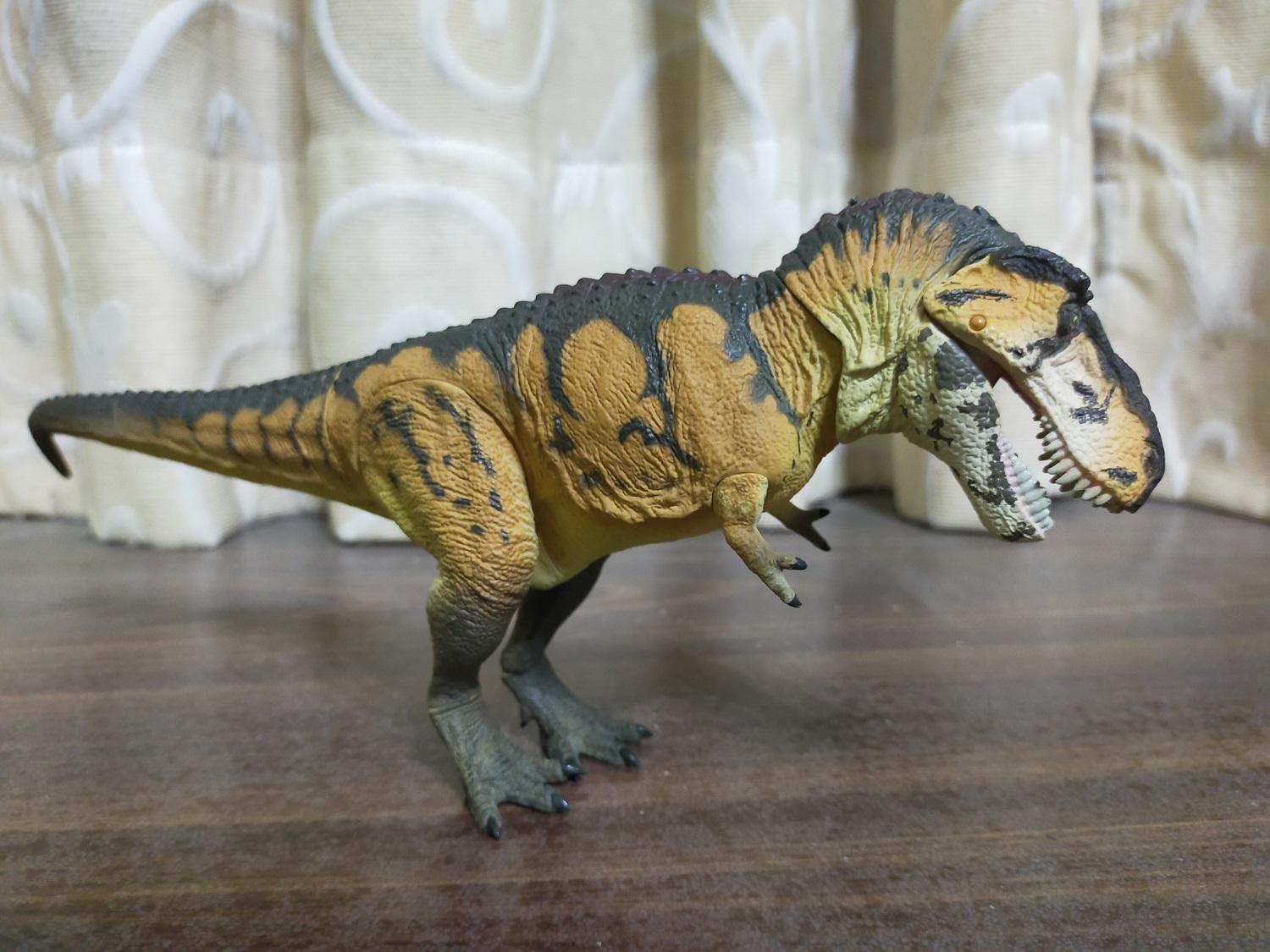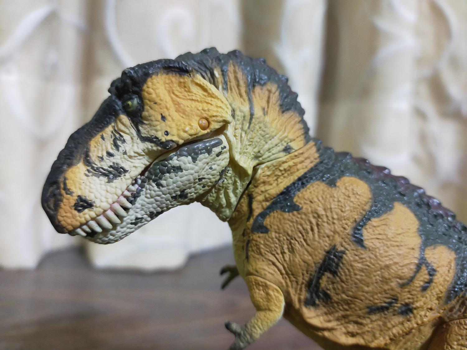 首先是作為普版的虎斑黃。產品貌似沒有標註比例,全長約27cm,半直立高度約15cm。假設這隻的原始尺寸是全長12公尺的成年個體,換算比例會落在大約1:44 Scale的級別