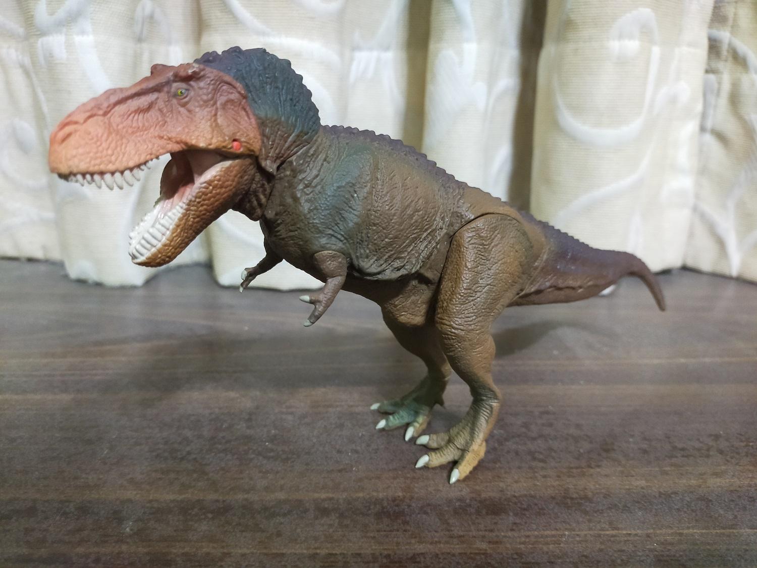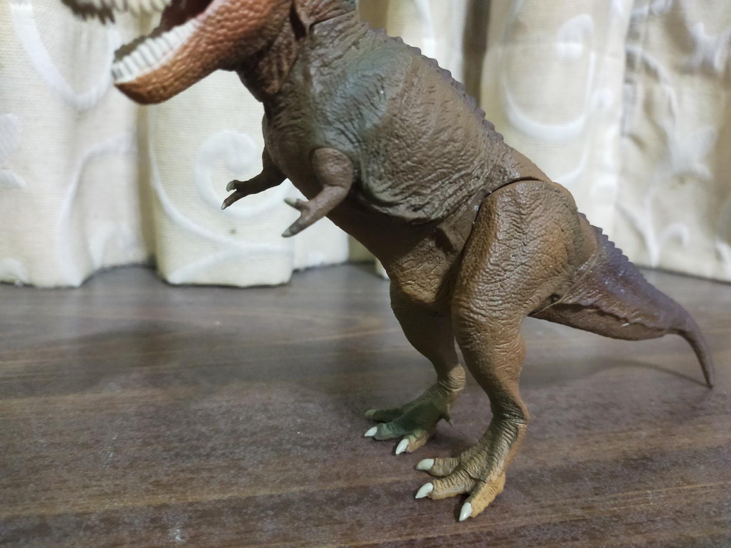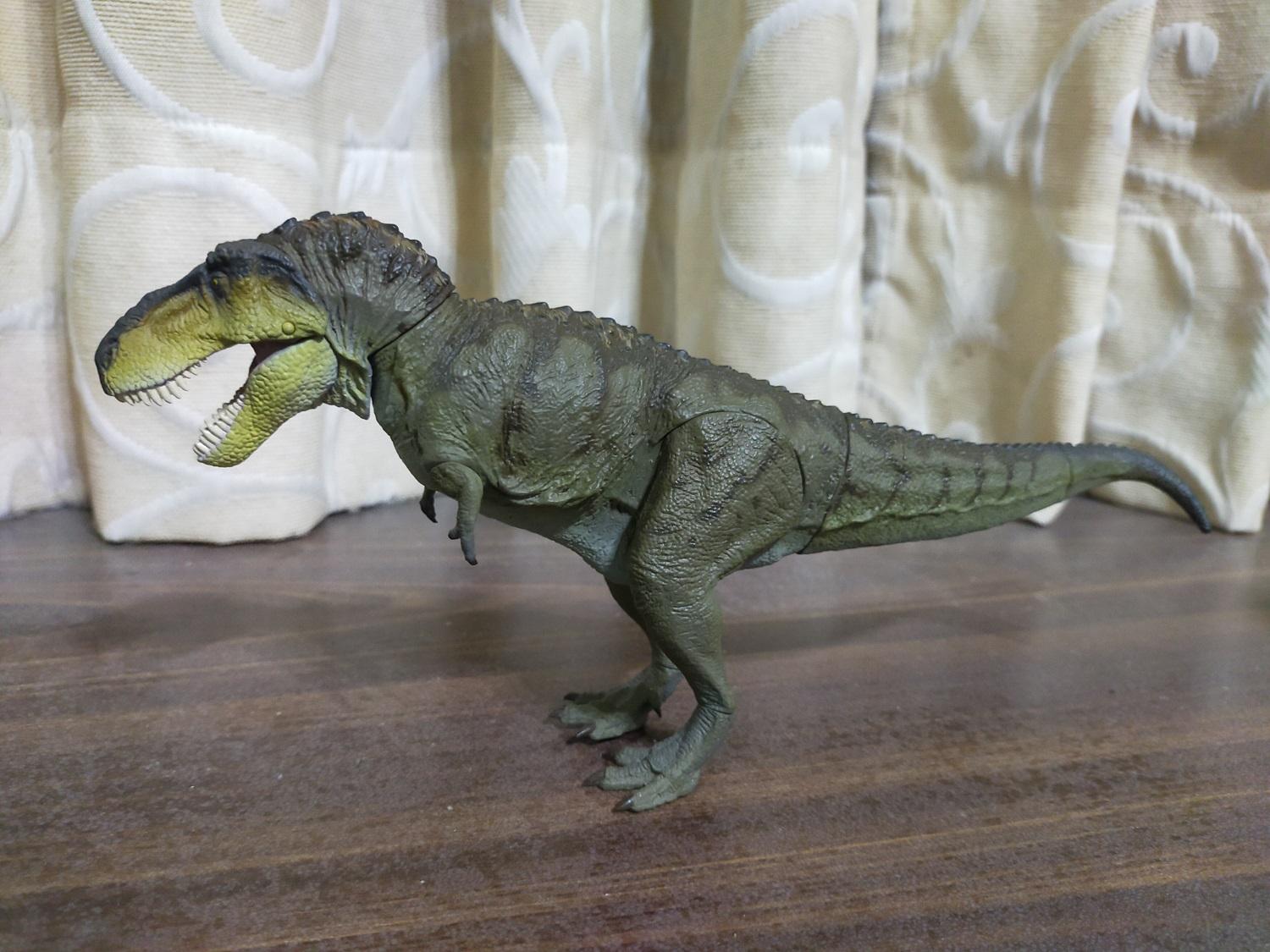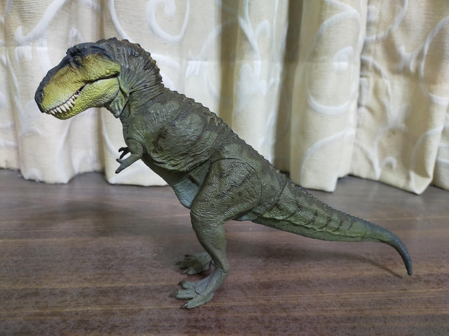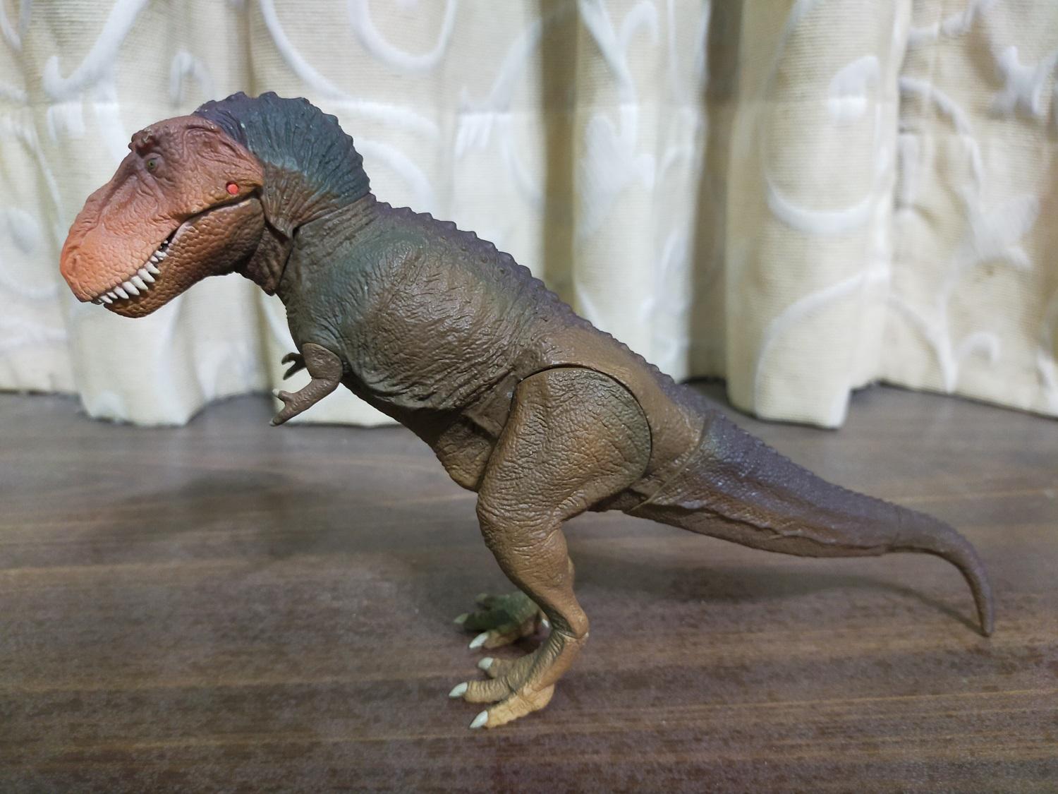 首先是作為普版的虎斑黃。產品貌似沒有標註比例,全長約27cm,半直立高度約15cm。假設這隻的原始尺寸是全長12公尺的成年個體,換算比例會落在大約1:44 Scale的級別