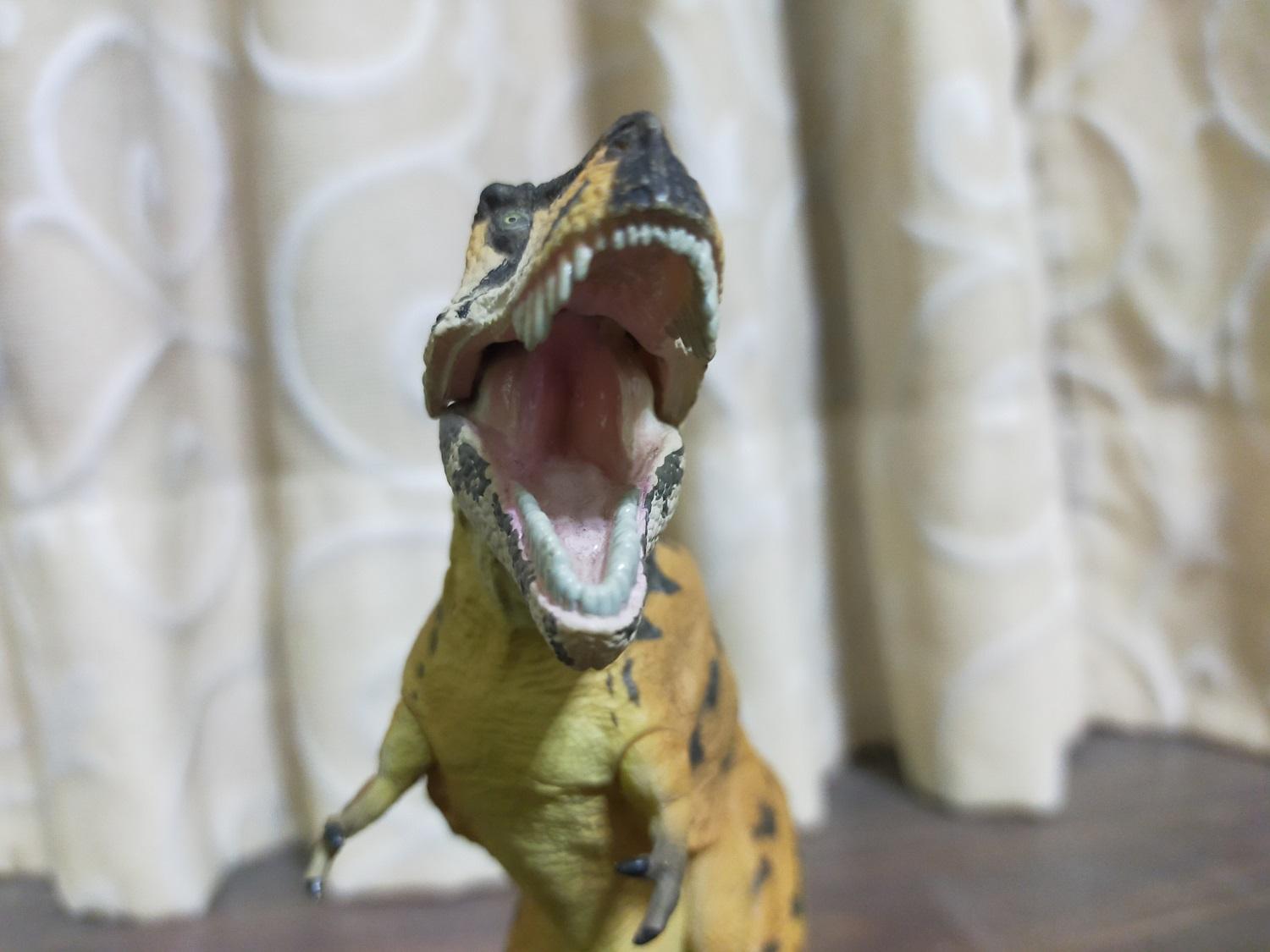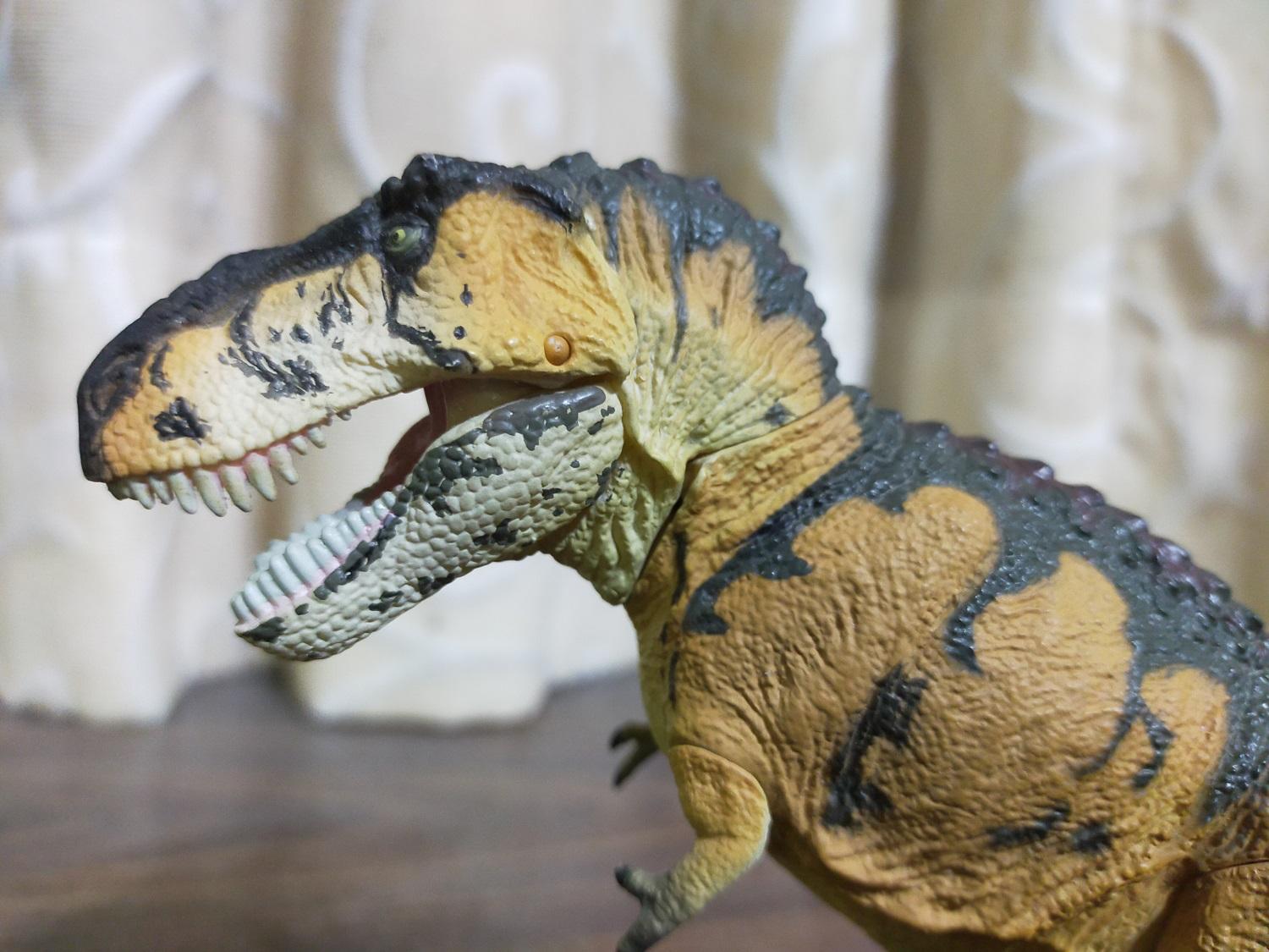 開闔角度最大程度就如圖中所示,看起來就很明顯的是在張嘴咆哮,而只有在把嘴巴全開後,整體才會顯現出那個恐龍之王的氣勢,而且曾有一度覺得很類似2015年國家地理頻道播映的『勇闖侏儸紀系列』中的兩部紀錄片《恐龍殊死戰》(Dino Death Match)和《霸王龍:終極至尊》(T. rex: Ultimate Survivor)中的使用復原形象在張嘴時的模樣,只是體色明顯不同(笑)
