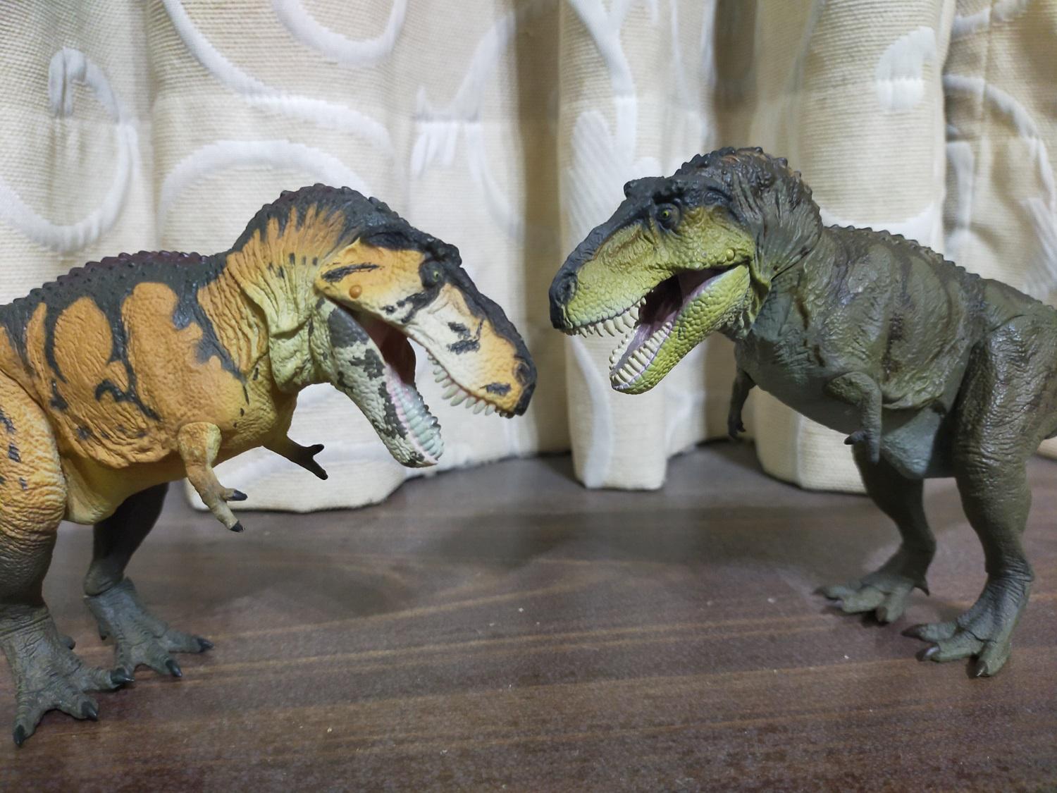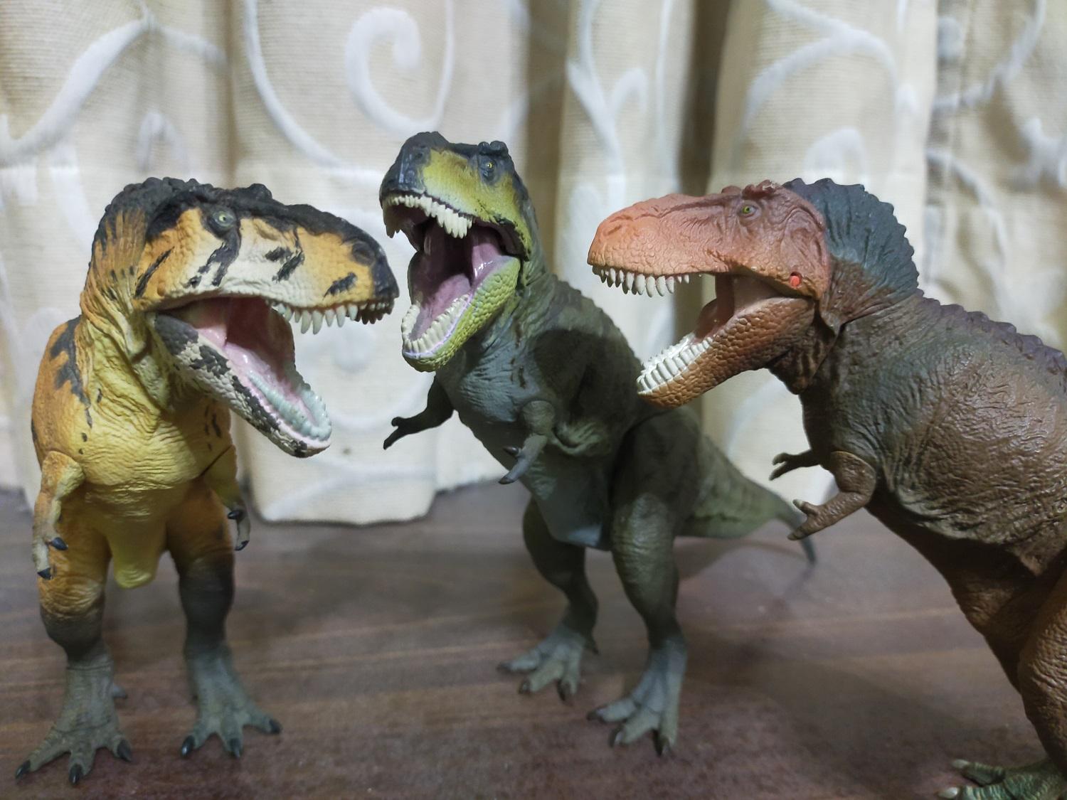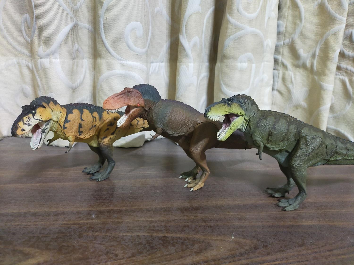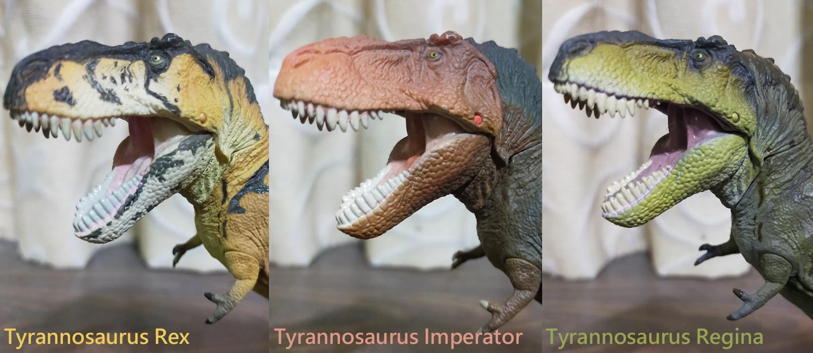 不,雷某自己是依照體色的不同,一廂情願的把另外兩款異色版視作暴龍屬旗下的不同品種,也就是前陣子古生物學家曾經額外劃分的,在霸王龍,或者俗稱的君王暴龍之外的兩個目前還帶有爭議跟不確定性的新品種,也就是俗稱的帝王暴龍(Tyrannosaurus Imperator)和女王暴龍(Tyrannosaurus Regina)