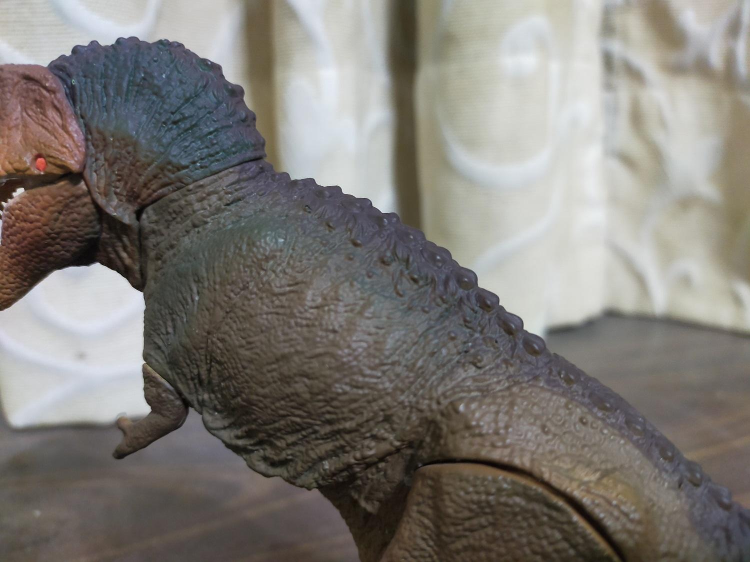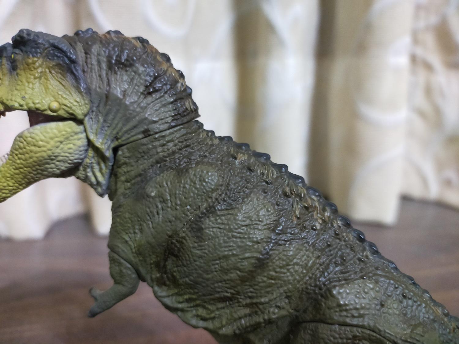 有經常收集日系軟膠產品的都知道,軟膠的另一個特徵就是身上的可動關節向來都很少,最多四肢有得動就是極限了;然而這隻霸王龍軟膠則不只四肢,還包含頸部、尾部,甚至嘴部也能開闔。再者和PAPO、Rebor、PNSO、本心楠改等經常把關節開在下顎的牌子不同,海洋堂是開在上顎部位的