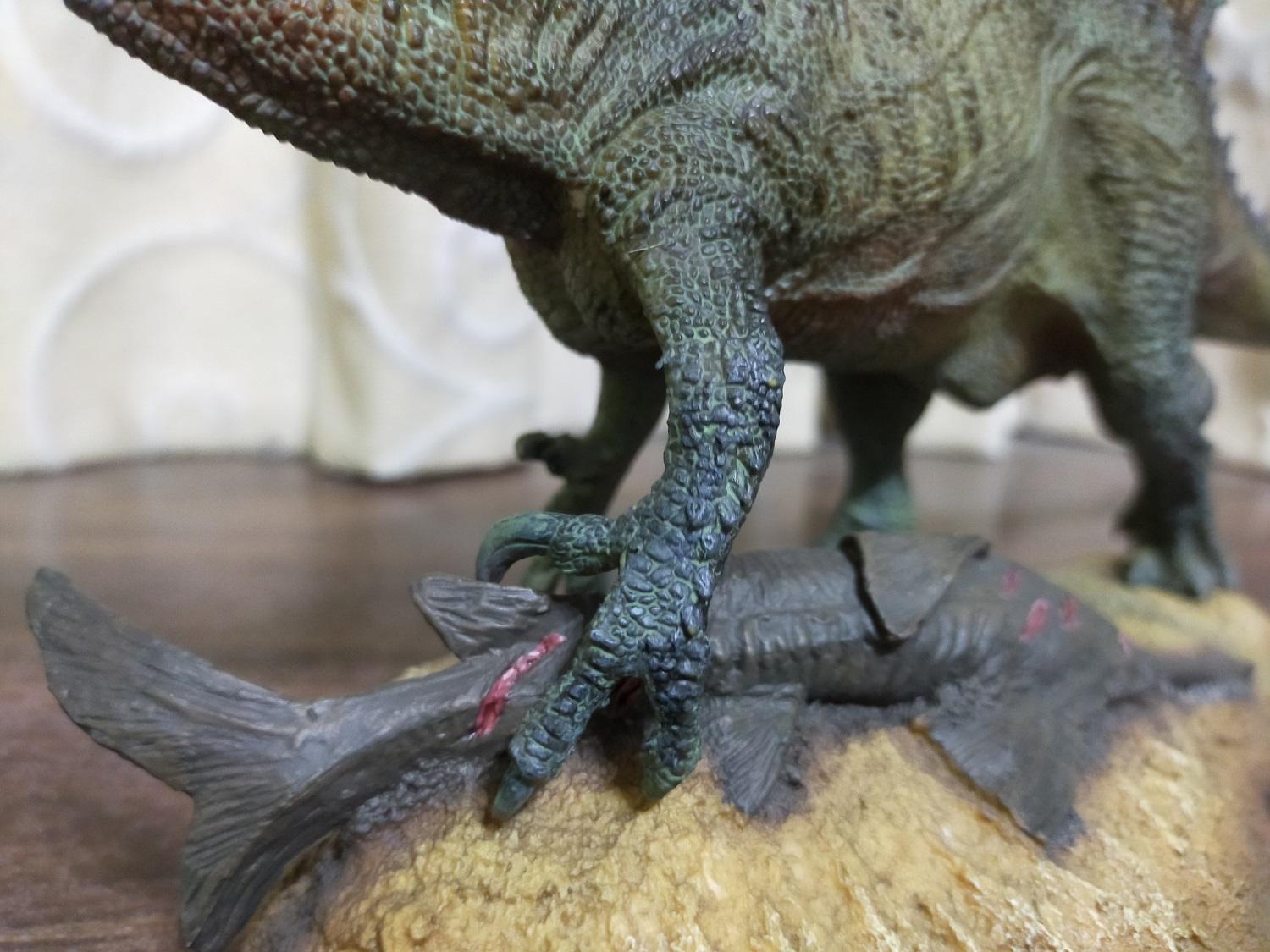 與霸王龍和巨獸龍不同,由於棘龍的底座沒有設支架,腳底部位也沒有支架孔,所以可以輕易拿離地台;只是在沒有底座腳印跟帆鋸鰩屍體來幫忙維持平衡的緣故,導致離開地台後就會因為重心不穩而只能如照片所示的擺放(汗)