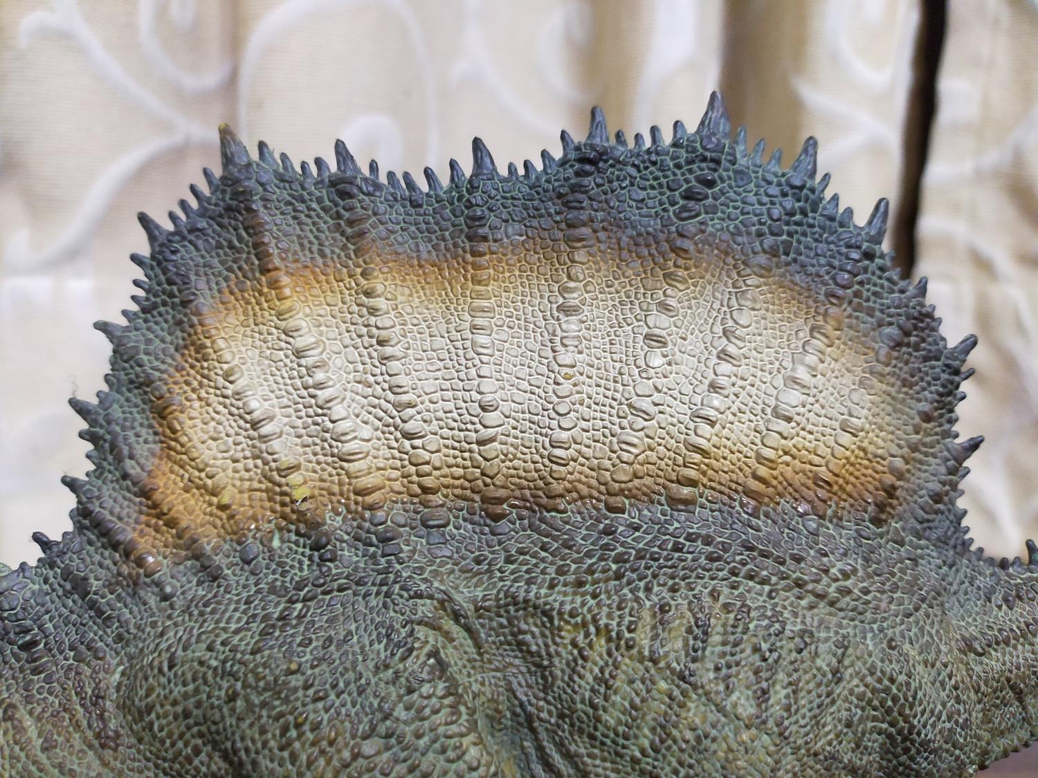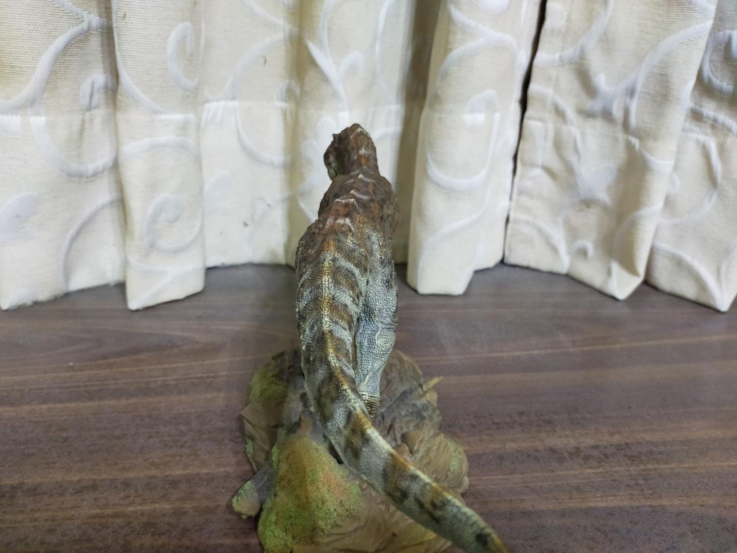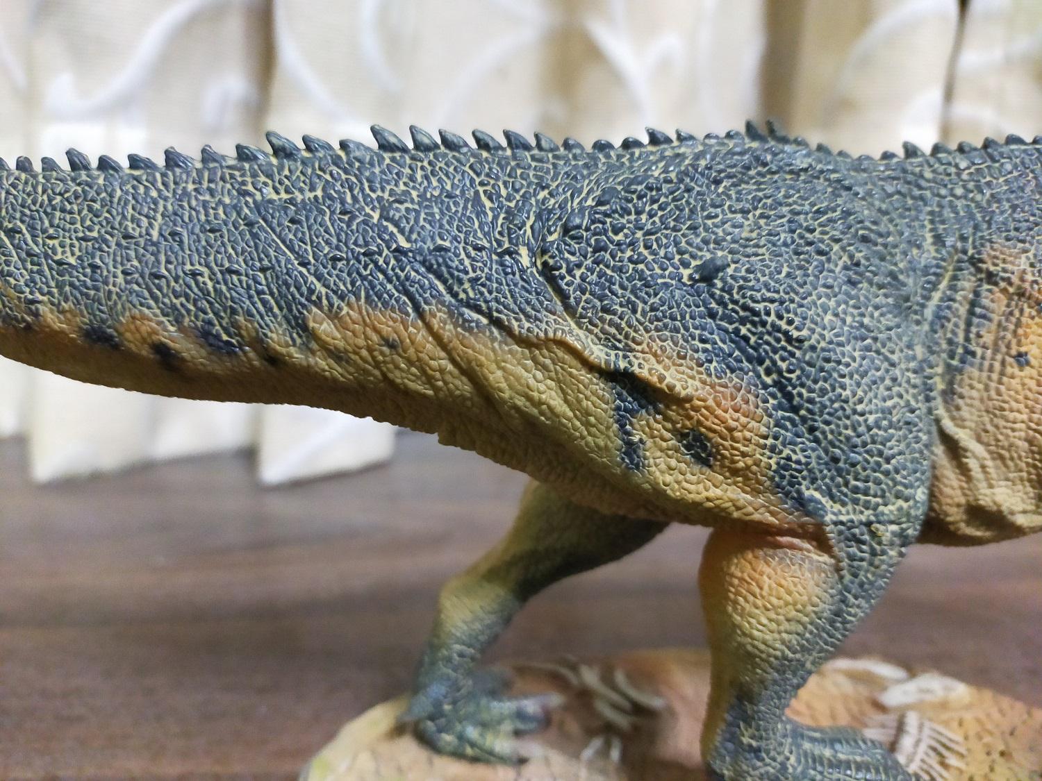 與霸王龍相較起來,該款巨獸龍扣除頭型太纖細的缺點,而且貌似也沒有說明是以哪一具標本為參考對象來製作復原模型,基本上應是以強調霸王龍欠缺的速度感為前提來塑型的;此外,基於本體的塗裝主色,加上排列於背部的棘刺還有頭部等風味使然,雷某自己會私心把它腦補成是東寶哥吉拉怪獸系列中的恐龍怪獸哥洛龍(Gorosaurus)在現實中所應有的模樣和姿態(笑)