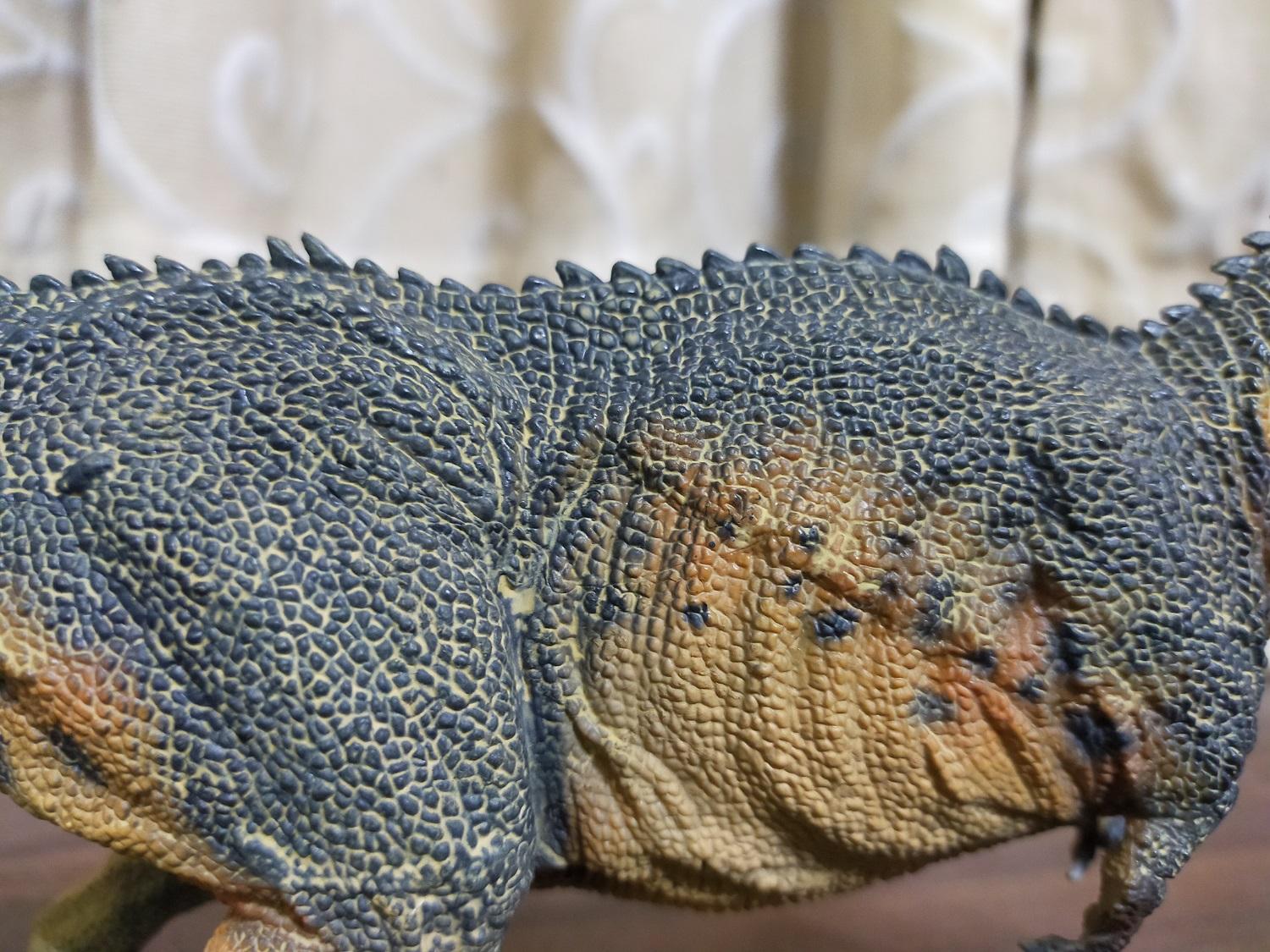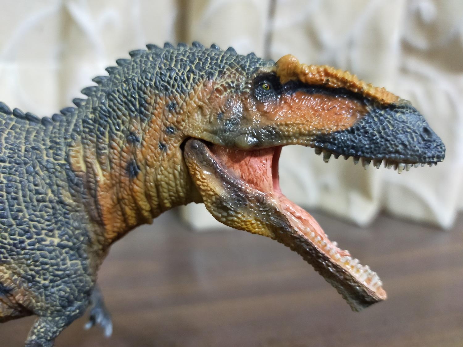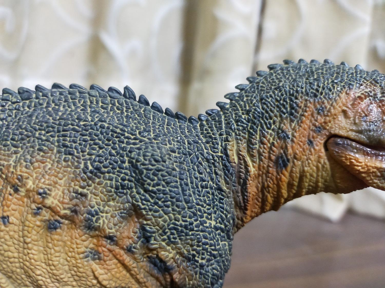 與霸王龍相較起來,該款巨獸龍扣除頭型太纖細的缺點,而且貌似也沒有說明是以哪一具標本為參考對象來製作復原模型,基本上應是以強調霸王龍欠缺的速度感為前提來塑型的;此外,基於本體的塗裝主色,加上排列於背部的棘刺還有頭部等風味使然,雷某自己會私心把它腦補成是東寶哥吉拉怪獸系列中的恐龍怪獸哥洛龍(Gorosaurus)在現實中所應有的模樣和姿態(笑)