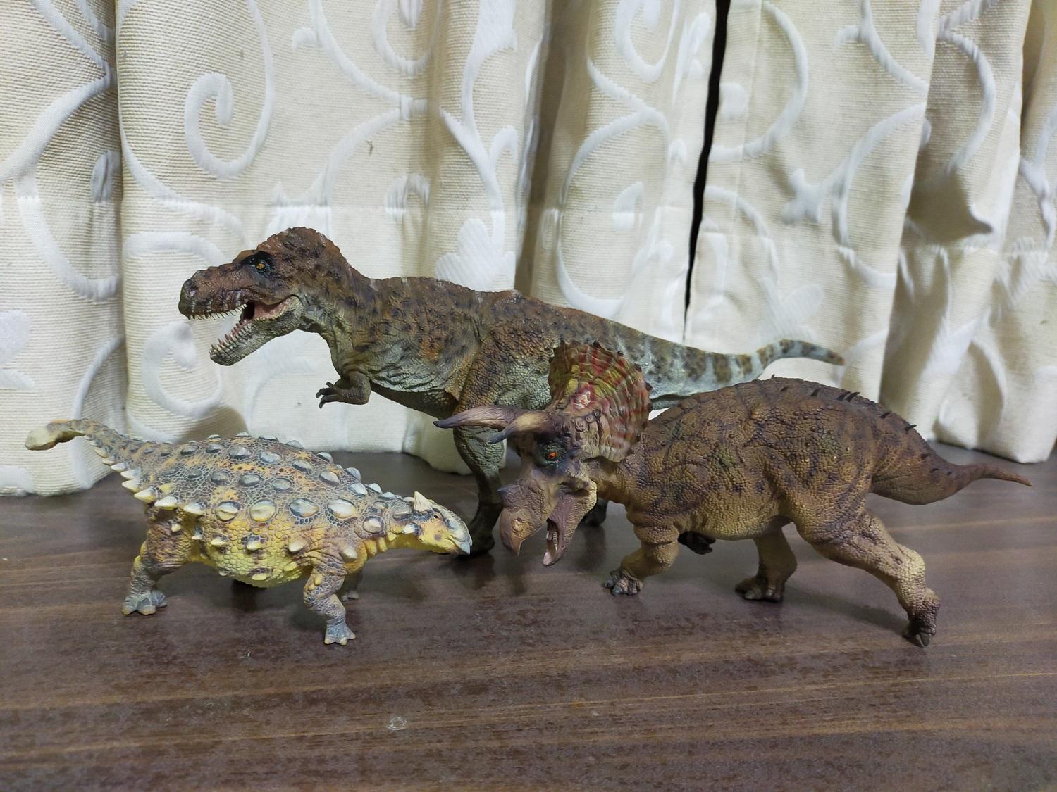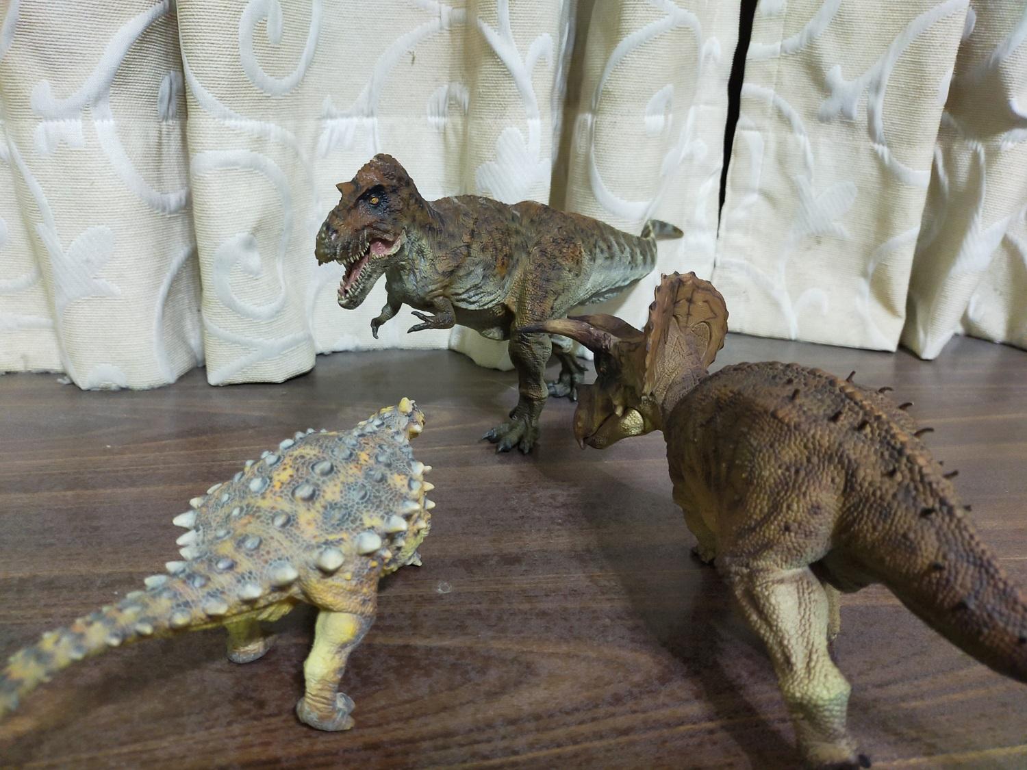 與霸王龍和三角龍比起來,甲龍的色調就滿鮮明的,不如前兩者來的晦暗;而且有因前兩者的主色重複的緣故,假如三角龍可以換成水泥灰之類的顏色,相信會讓這個組合之間的色彩對比在更加突出之下,更顯得賞心悅目吧?(被拖走)