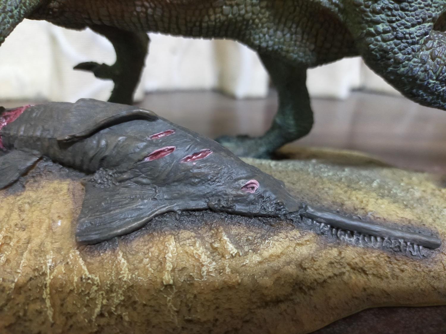 作為獵獲物並被設於底座地台的帆鋸鰩。這個掛掉的表情怎麼看著還有種很悠哉的感覺...?大概在被獵殺之前的生活至少過得很愉快ww (被毆+被拖走)
