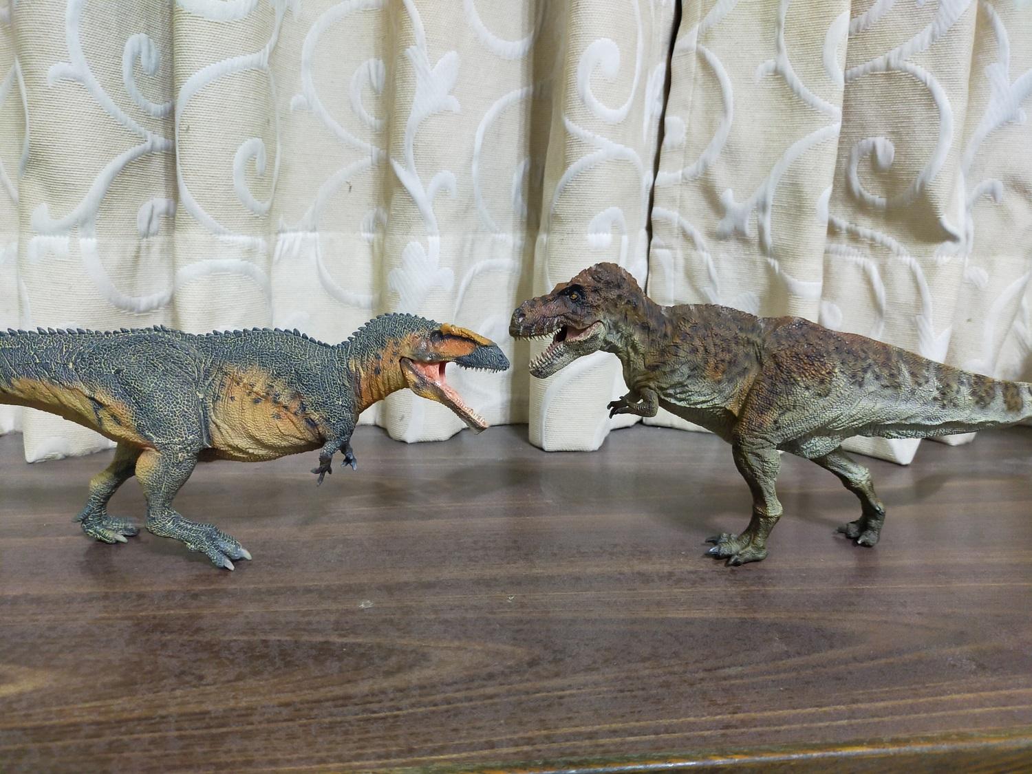即使因為站立姿勢的問題,就算頭部至高點不如霸王龍,那個體格和幅度的差異還真是滿明顯的(汗)