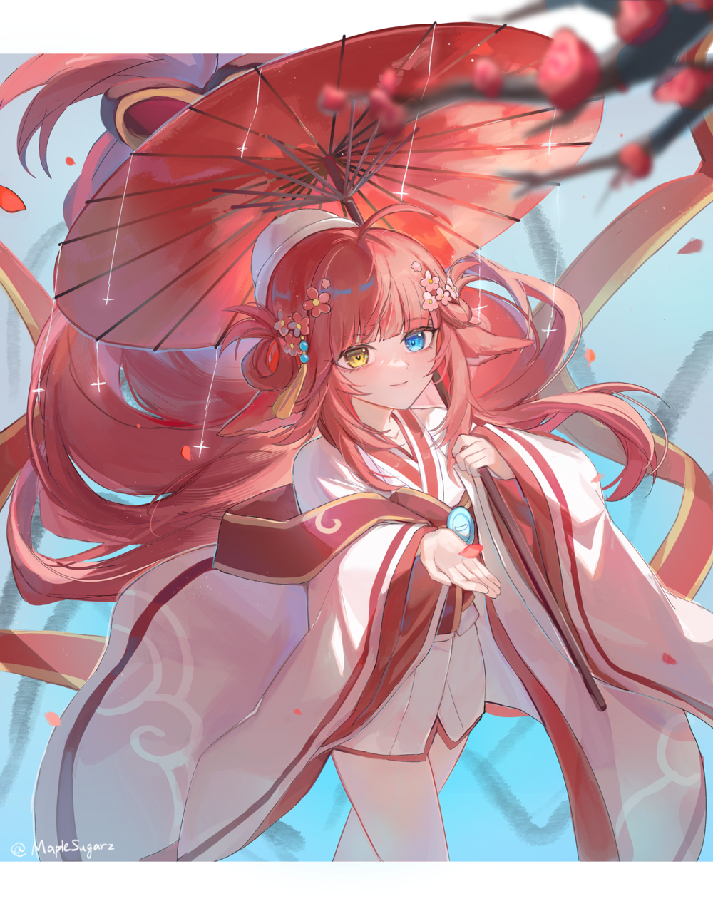 咖凌黑化前的恬靜氣質,梅花點綴白紅相間的服飾,搭配白色的小帽