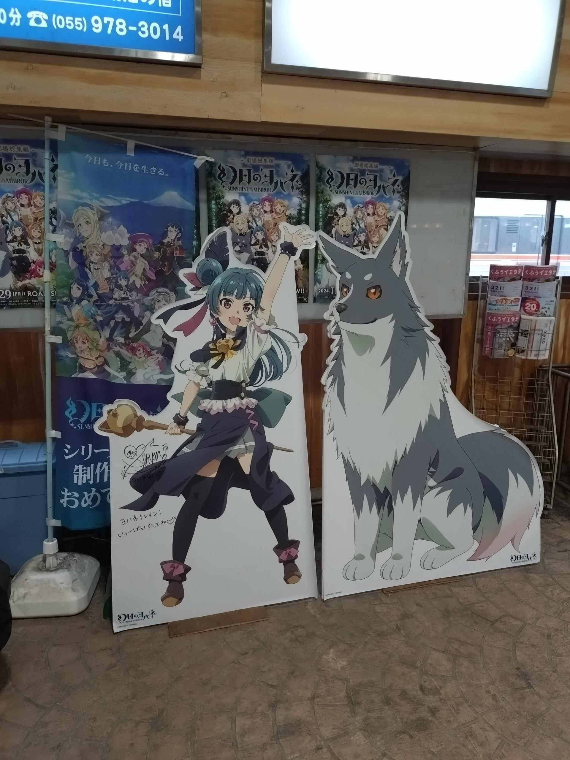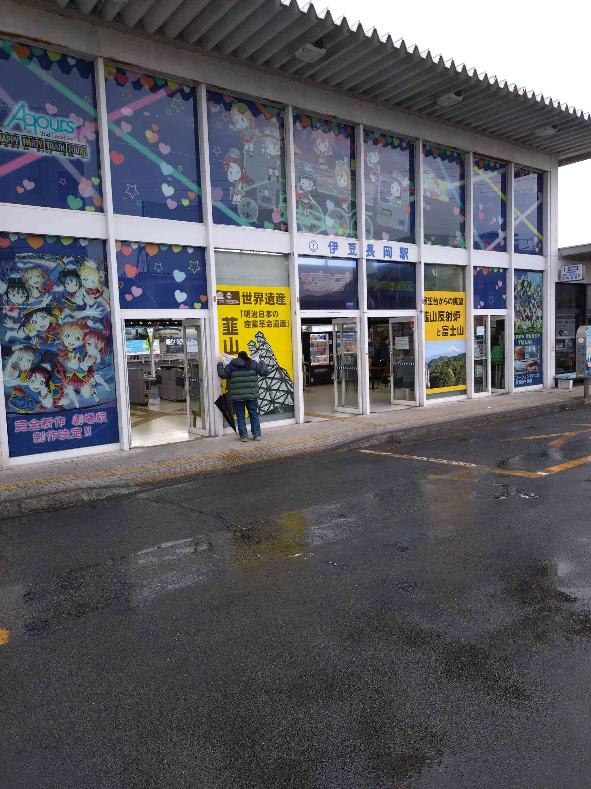 電車慢悠悠地晃過伊豆之國,這個「晃」所言不假,有種座小型海盜船的感覺,不愧是Aqours樂園。海盜船準時抵達伊豆長岡站,這裡是Aqours第二季和三單的取景地,但現有的站房是之後才加蓋的,原本應該只有旁邊的鐵皮站房。走到站前廣場看了看,突然覺得伊豆長岡車站有點像遊樂園售票處,這人真的病了。