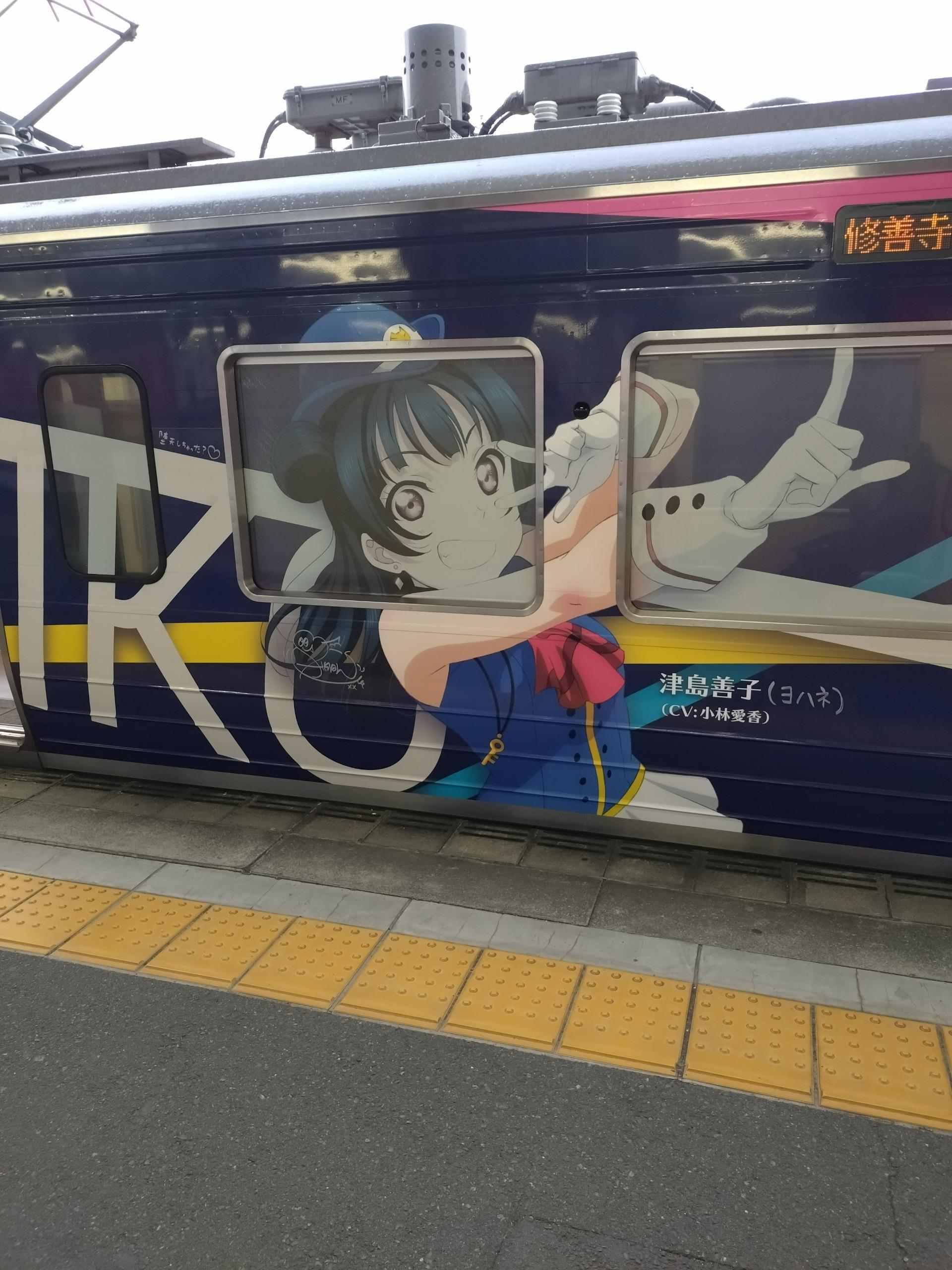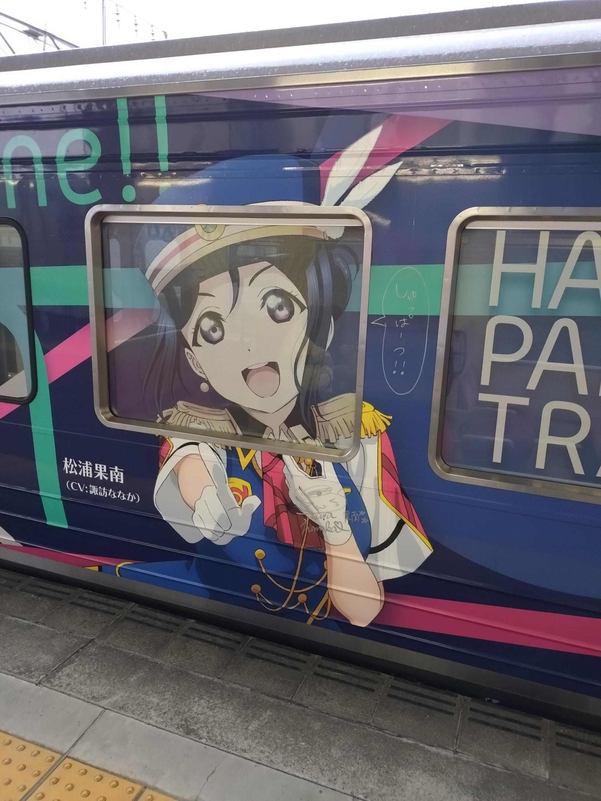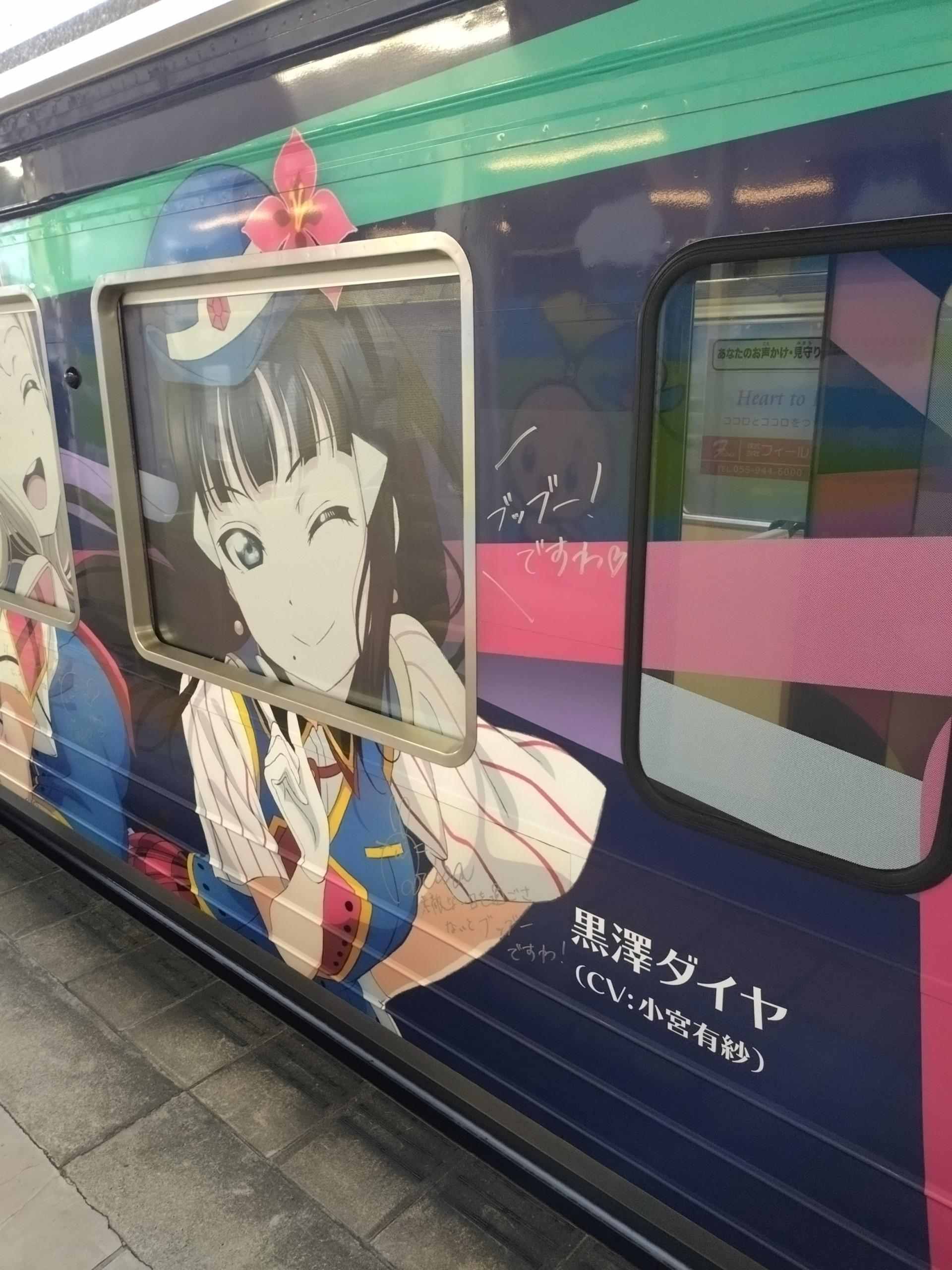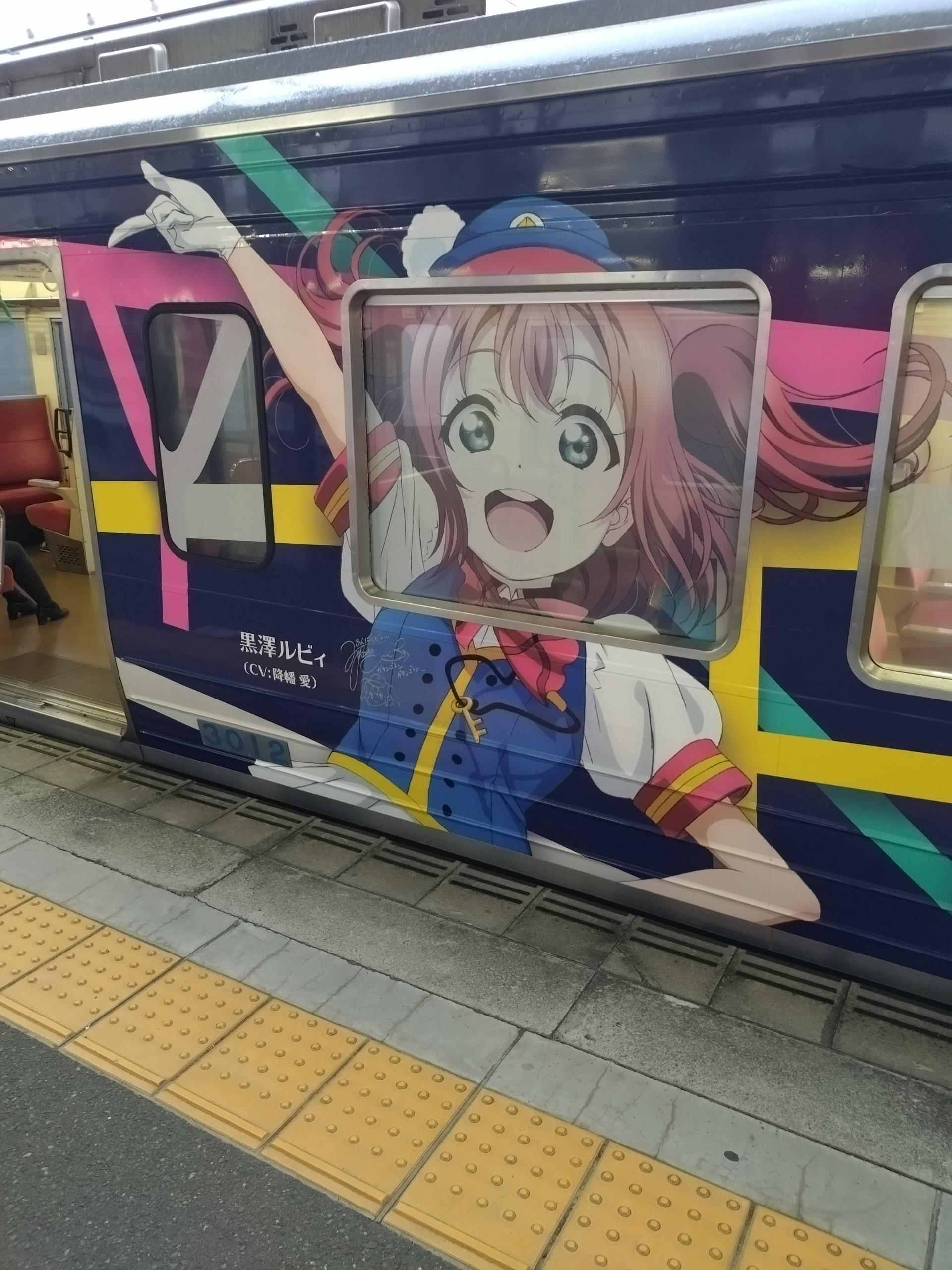三島站,或說Aqours樂園的後門,從這裡搭乘伊豆箱根鐵道駿豆線再轉公車就可以抵達沼津內浦。雖然時間比起直接搭東海道線到沼津還要慢上許多,但對於想要收集搭乘各種痛車經驗的我來說,繞路大概就是提早抵達旅行起點的意思吧。穿過長長的地下道,來到了伊豆箱根鐵道的月台。龐然大物,塗抹著繽紛的色彩,剩下因為太激動了所以說不清楚。也顧不得旁人的眼光拿著手機拼命拍照,不過搞不好通勤的居民們也早就習慣了吧。此時因為下雨而灰暗的心情也撥雲見日了,希望晚點的天氣也會如此。