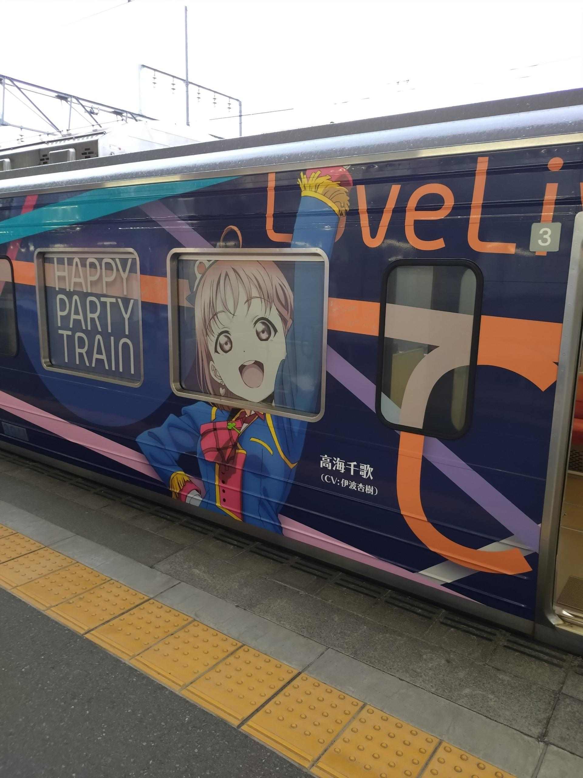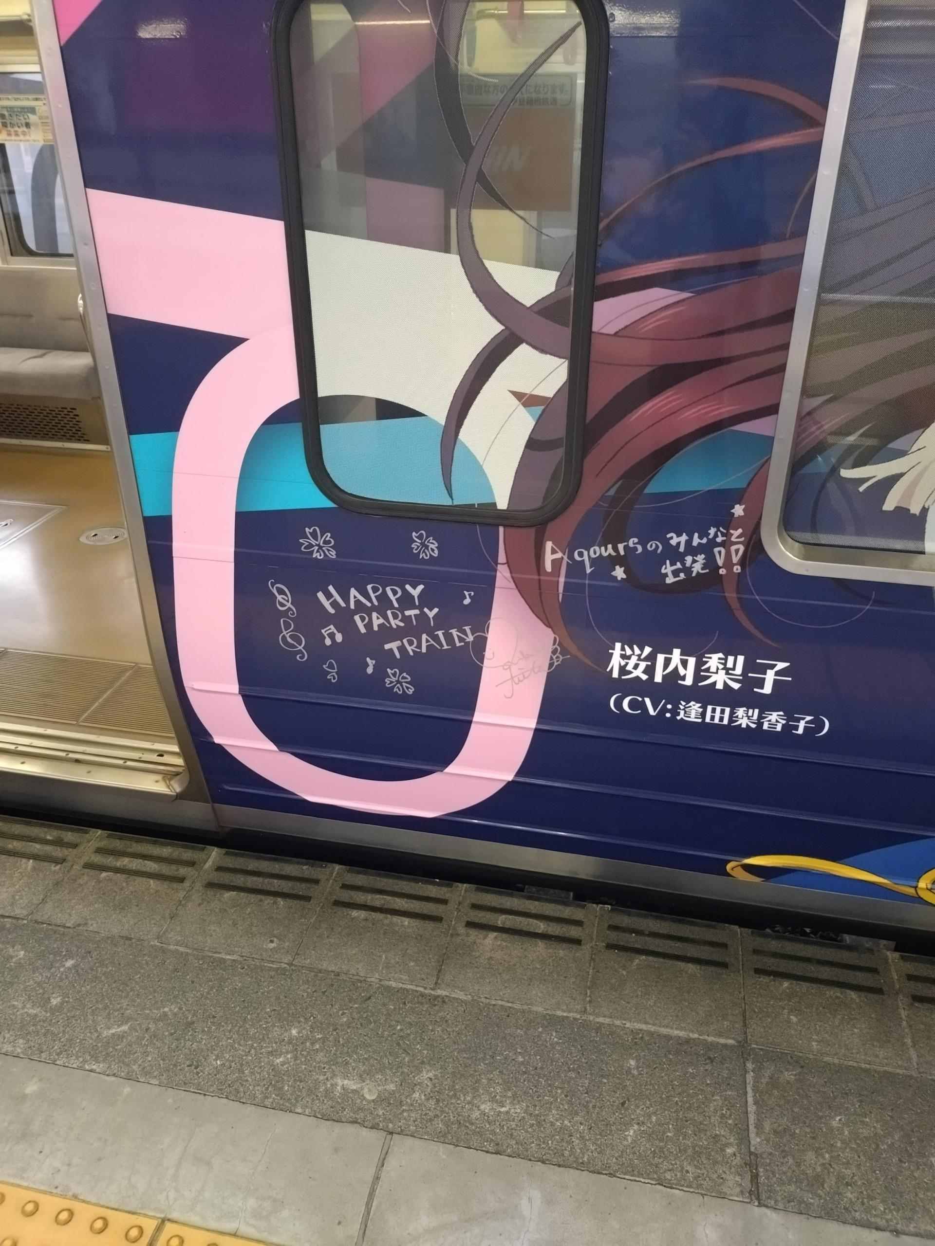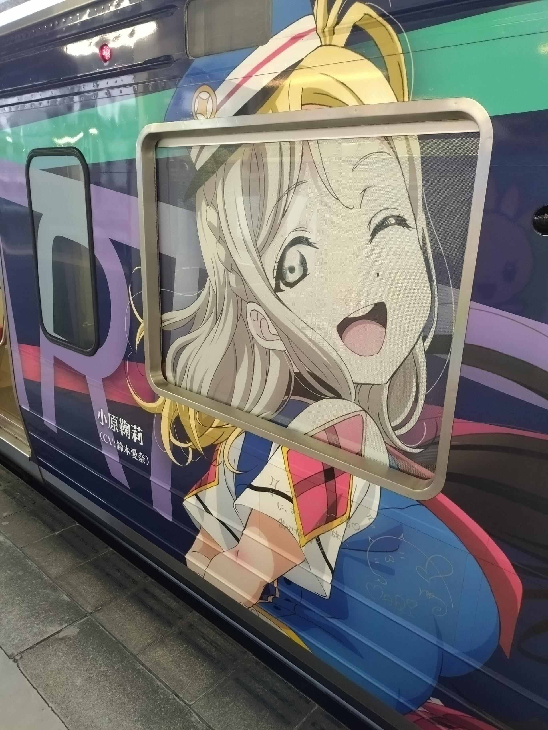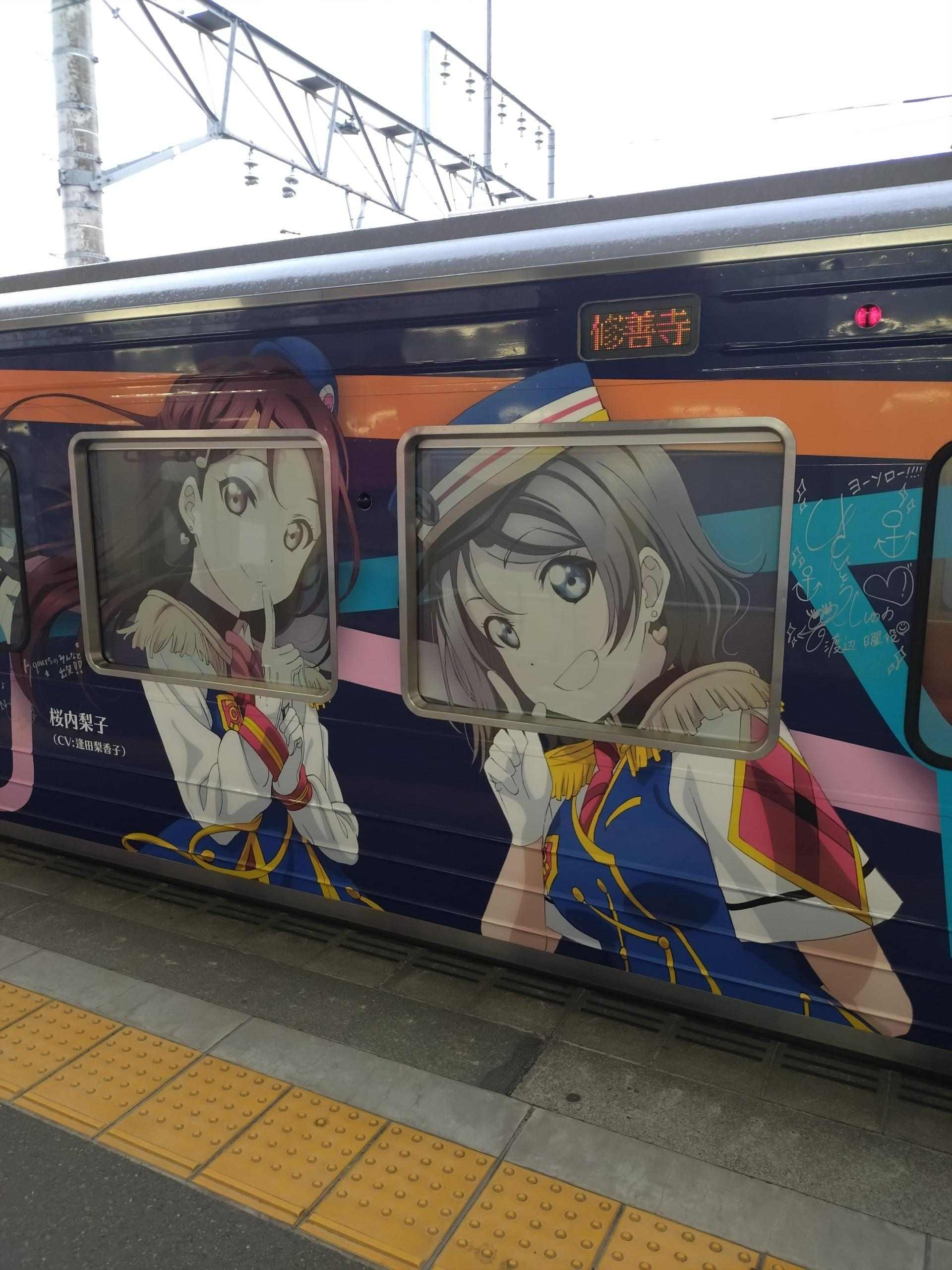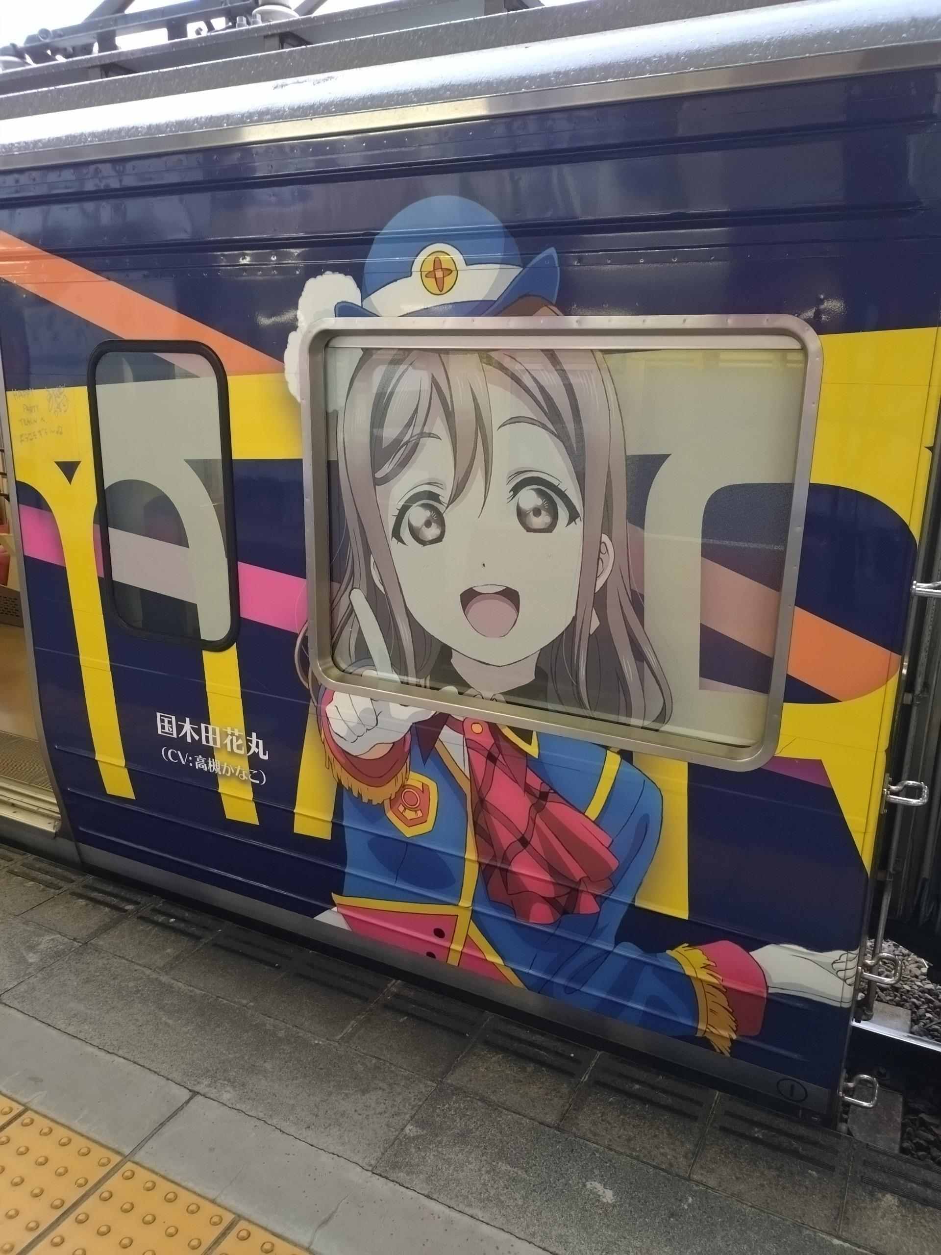 三島站,或說Aqours樂園的後門,從這裡搭乘伊豆箱根鐵道駿豆線再轉公車就可以抵達沼津內浦。雖然時間比起直接搭東海道線到沼津還要慢上許多,但對於想要收集搭乘各種痛車經驗的我來說,繞路大概就是提早抵達旅行起點的意思吧。穿過長長的地下道,來到了伊豆箱根鐵道的月台。龐然大物,塗抹著繽紛的色彩,剩下因為太激動了所以說不清楚。也顧不得旁人的眼光拿著手機拼命拍照,不過搞不好通勤的居民們也早就習慣了吧。此時因為下雨而灰暗的心情也撥雲見日了,希望晚點的天氣也會如此。