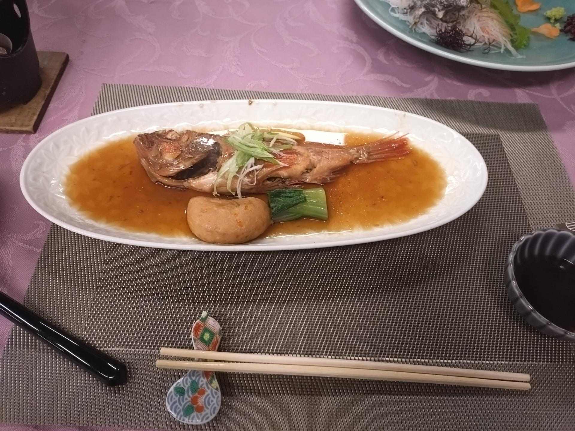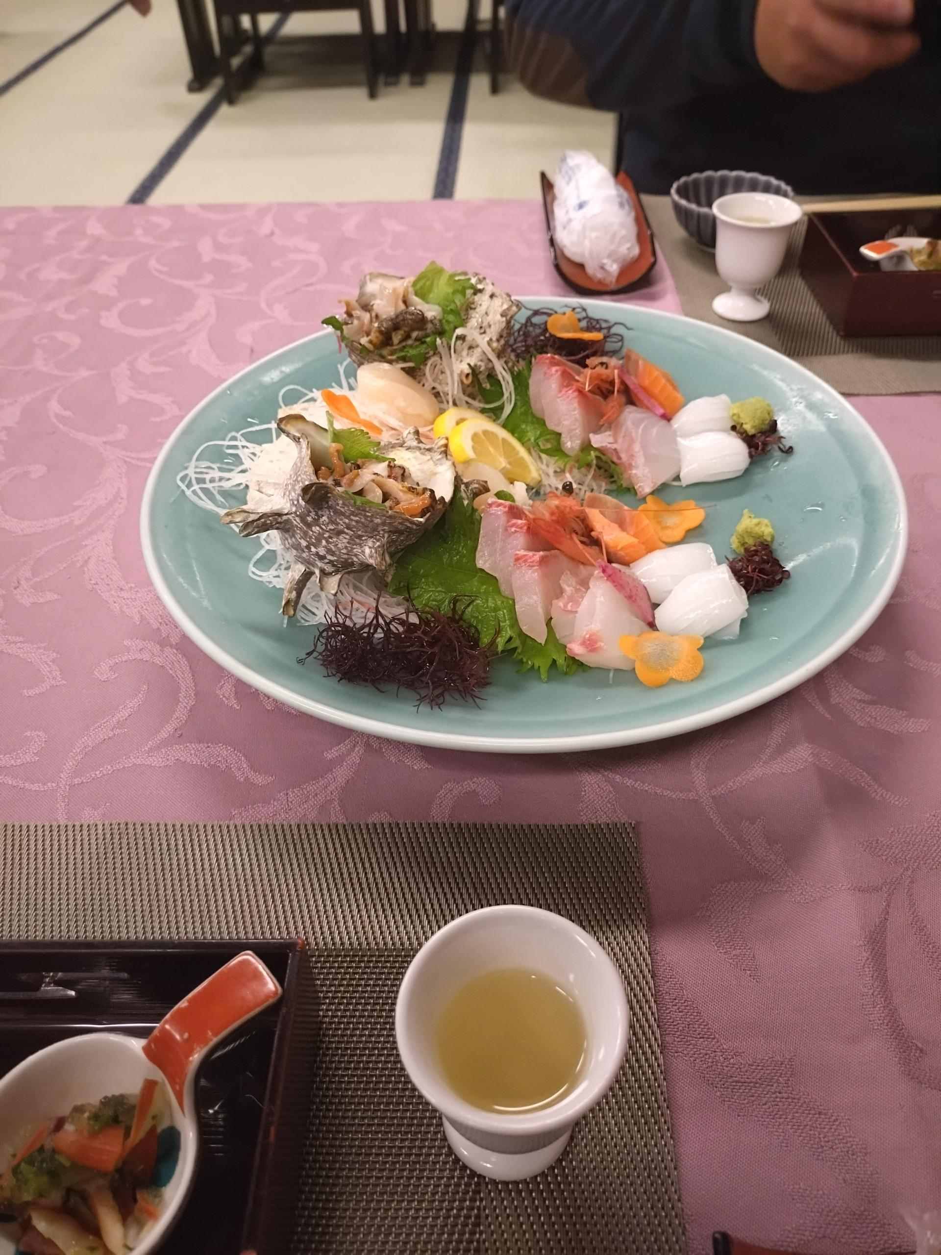 跟令人懶惰的天氣(和暖桌)東拉西扯了許久,六點走進餐廳吃晚餐。我們預定的套餐是生魚片套餐,總共有七道菜。餐前酒(蜜柑酒,應該是壽太郎那款)、前菜、生魚片拼盤(透抽、真鯛、鮭魚、甜蝦、干貝、サザエ跟應該是鰤魚的魚)、醬煮金目鯛(真的好吃)、什錦烏龍、味噌湯泡飯和最後的蜜柑布丁。反正我也講不出什麼具體的評論,那就講一聲好吃帶過吧。真的好吃,下次還要換個套餐吃吃看。