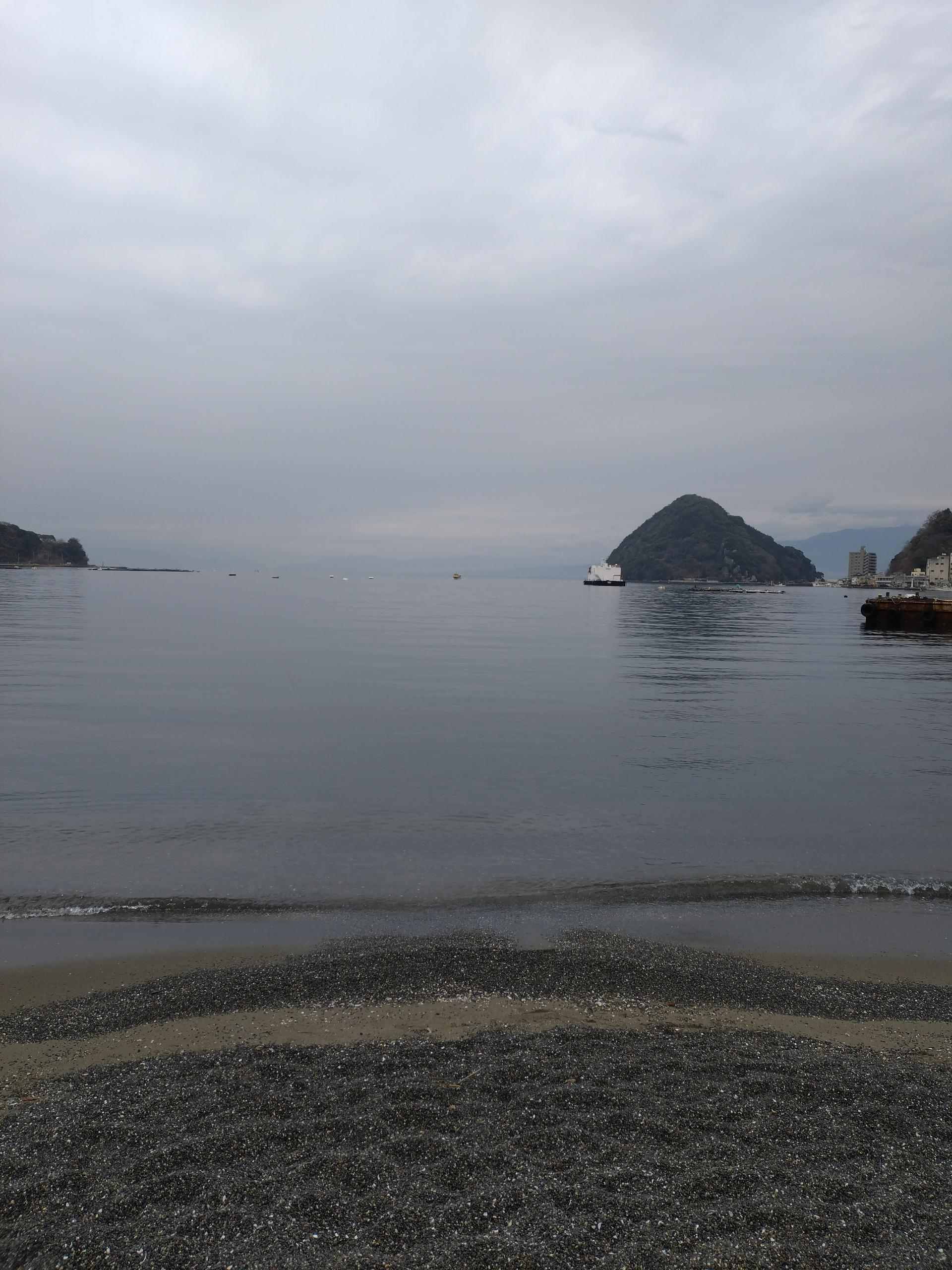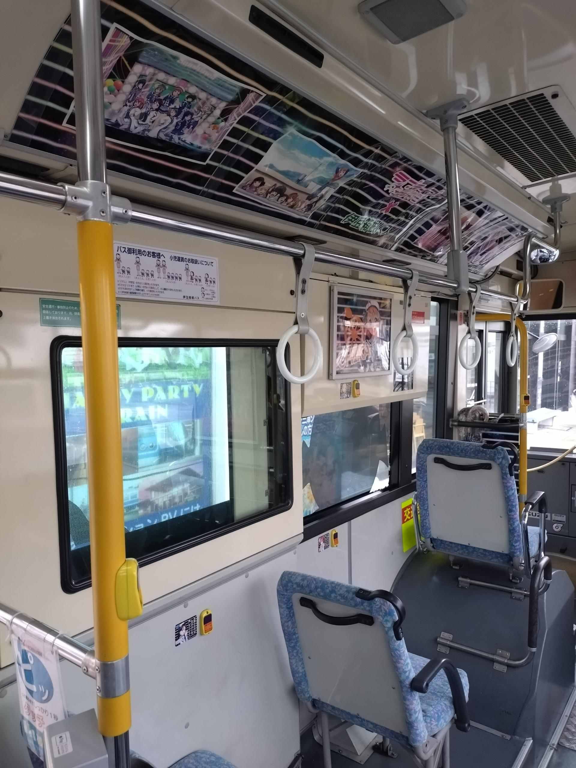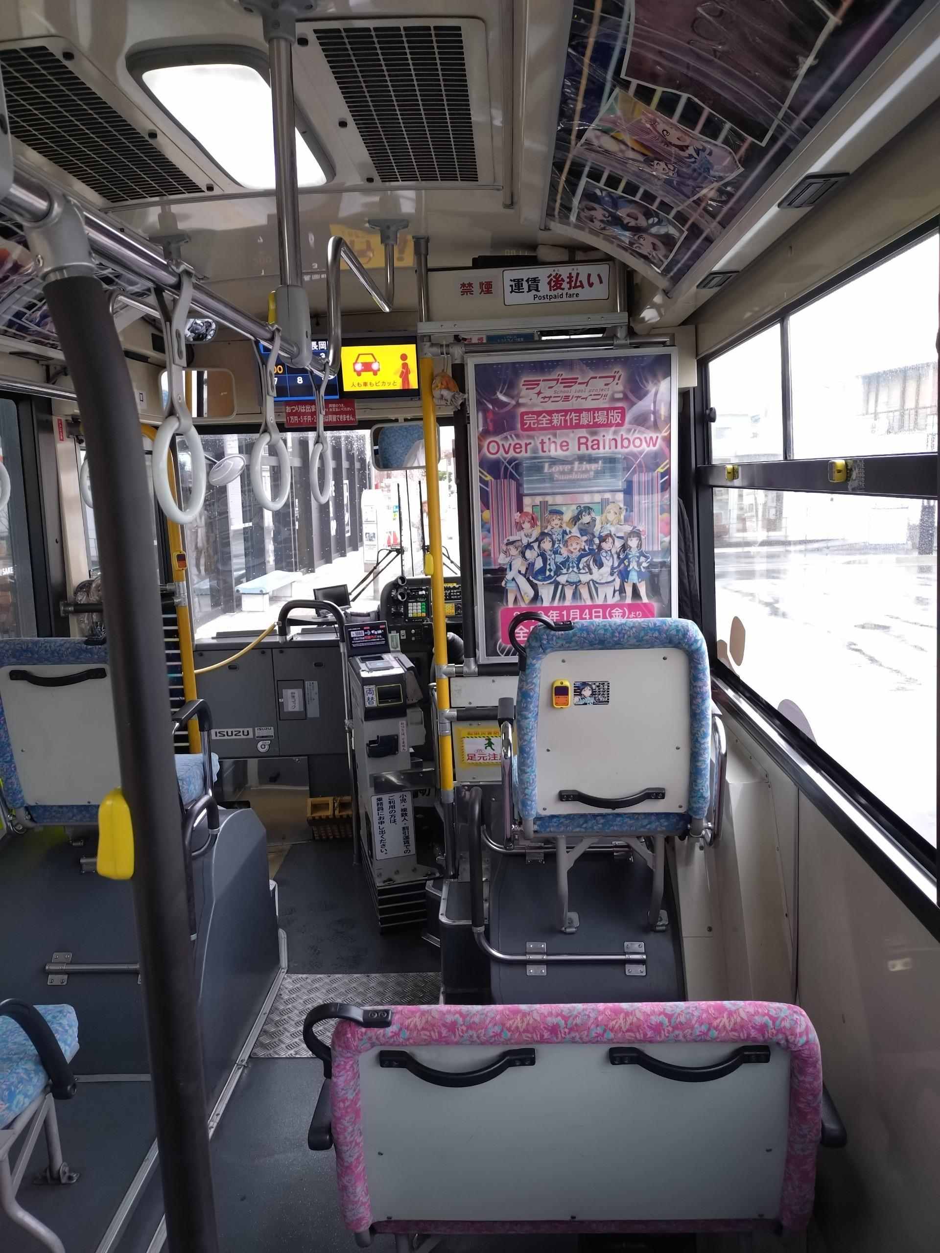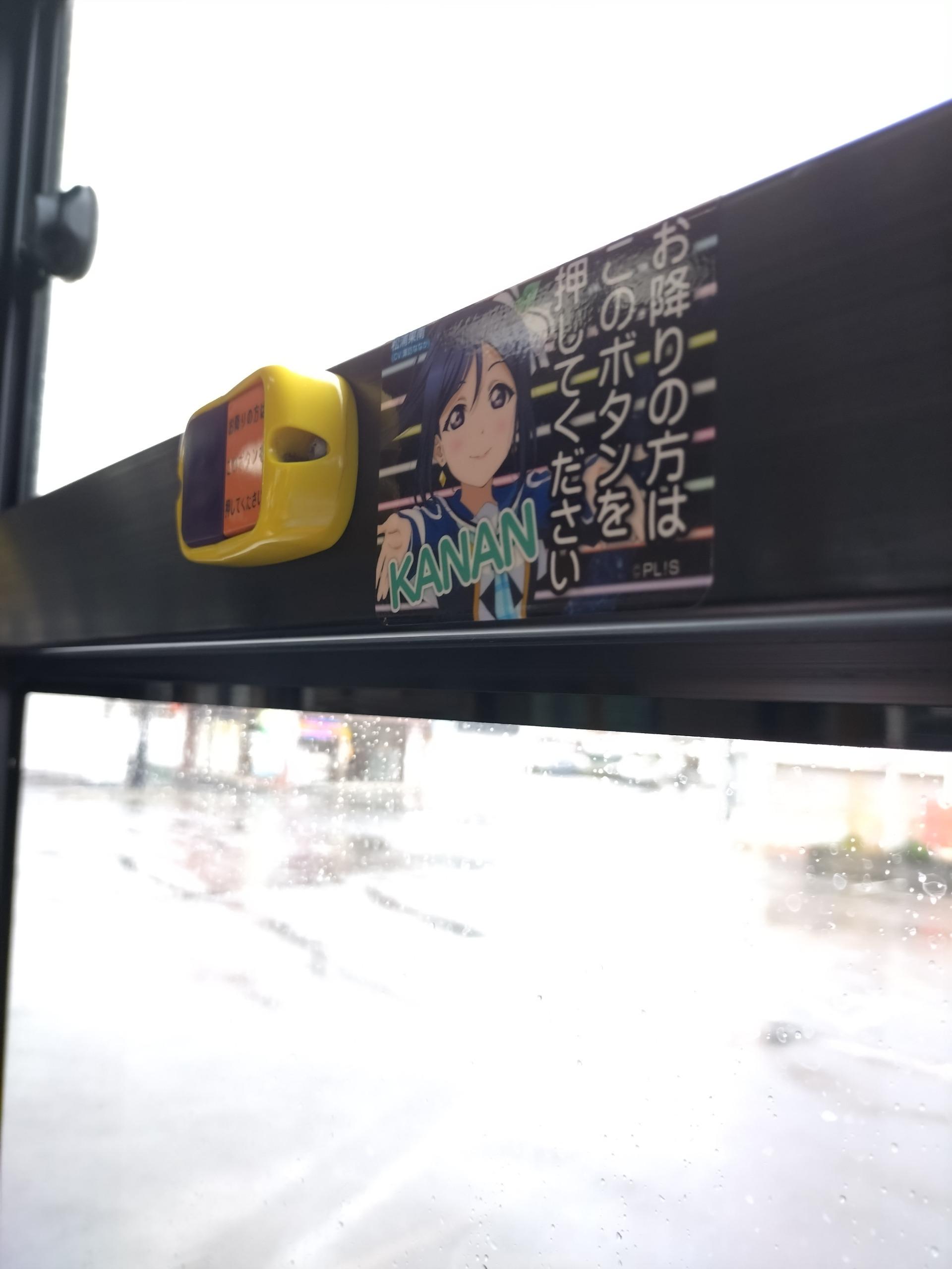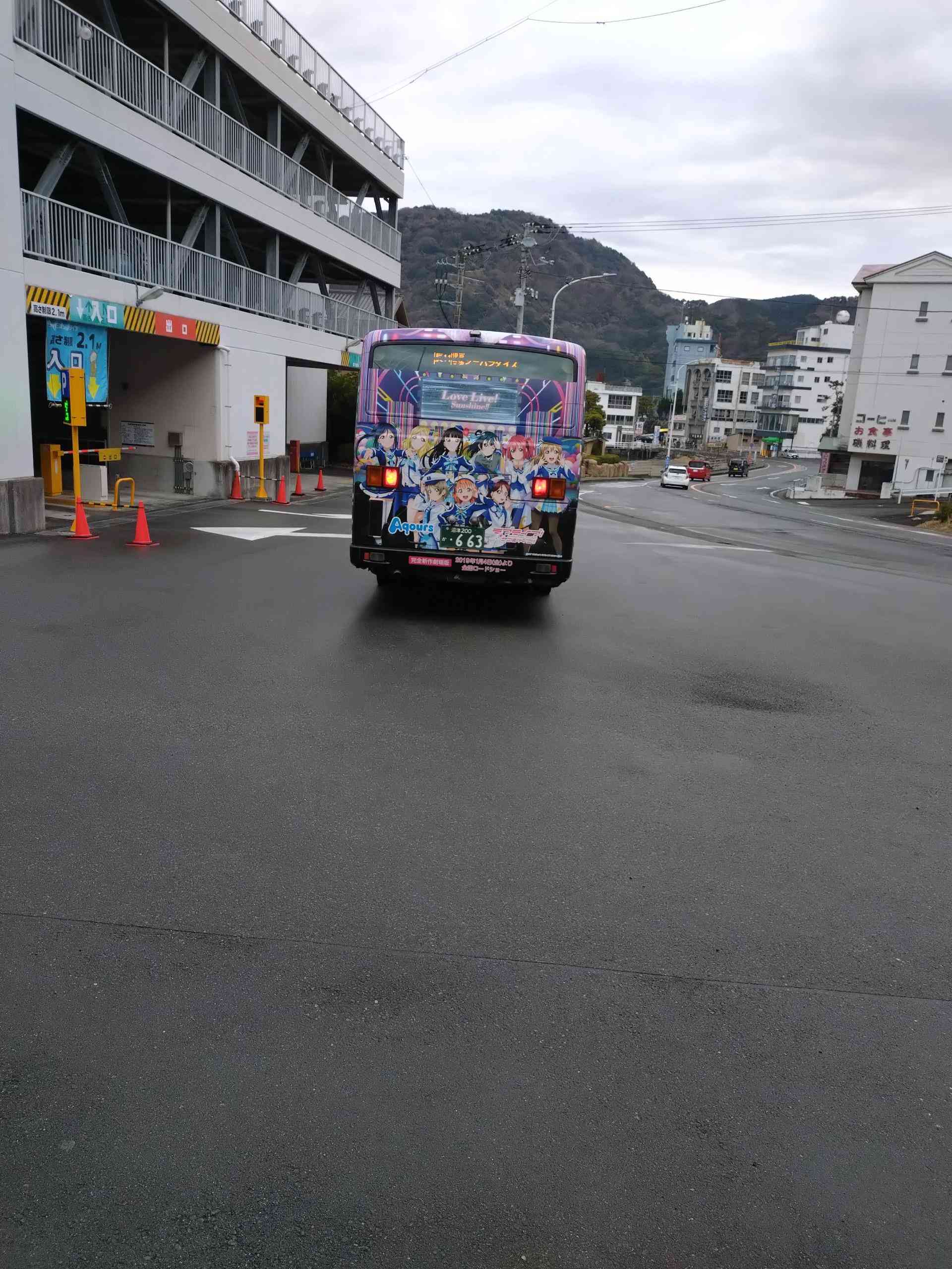 在等公車的時候,站前廣場停了一台痛公車,那時候跟C開玩笑說,欸欸等等會不會是搭那台啊。當初以戲謔的語氣說如果真搭到了那大概不用抽演唱會了。嗯,看起來是不用抽了。公車在伊豆長岡附近繞呀繞的,爬過一座山之後,一大片海映入眼簾,是傳說中的內浦灣!更令人驚奇的是,雨停了,烏雲稍微散開透出了碧藍的天空,難不成這就是奇蹟?