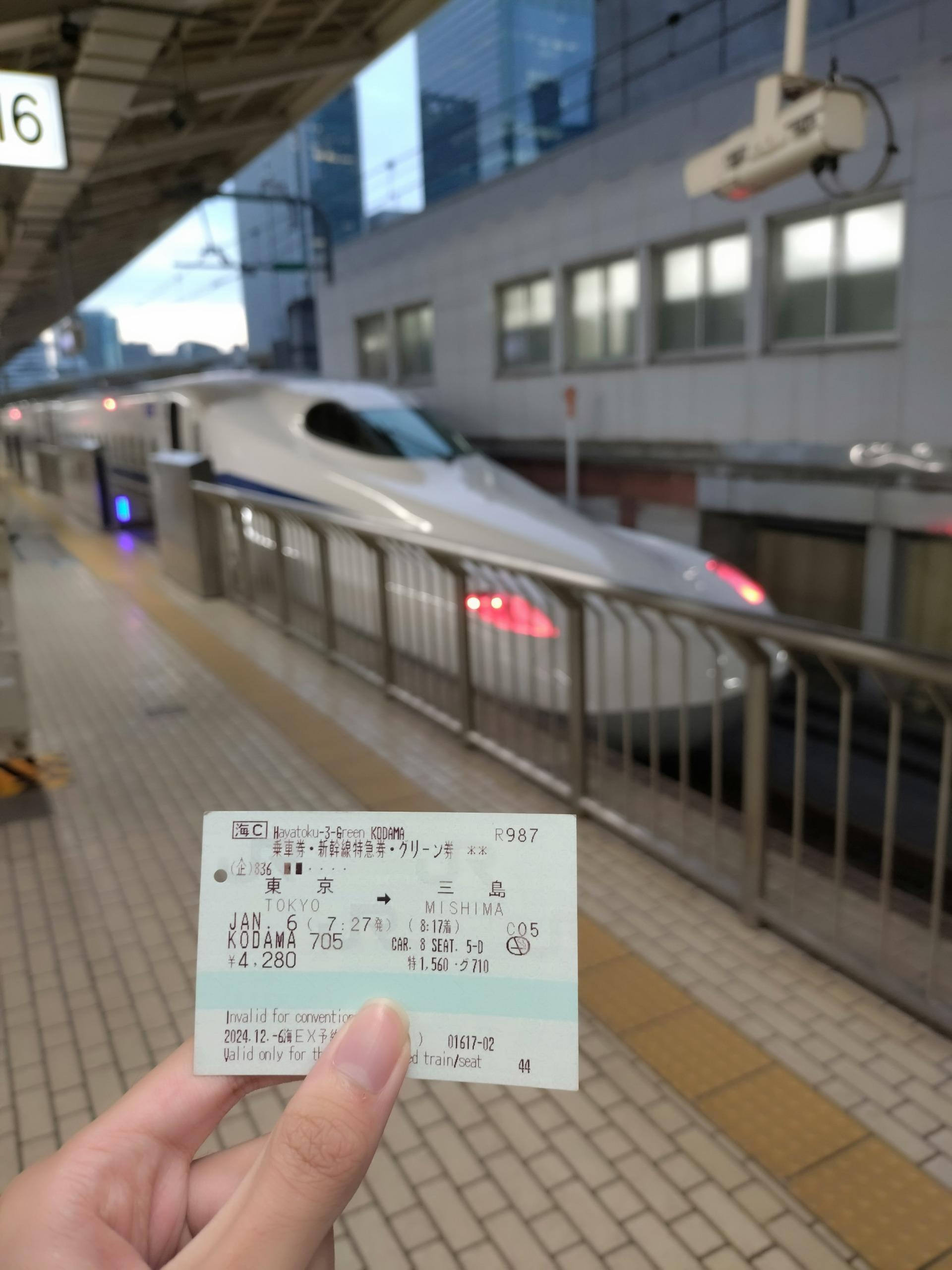 當天的天氣跟今天的天氣一樣,令人感到慵懶。按耐著睡意從被窩裡爬出來(真的是用爬的出來,還差點摔倒)。拖著行李,走在空無一人的東京街頭。因為是新年假期,大家應該都還在睡吧,行李箱喀拉喀拉的聲音不知道會不會吵醒他們呢?昨天小腿的疼痛有因為休息而恢復了大半,雖然在跨大步的時候還是有點彆扭,但總歸來說應該是可以應付接下來的行程了。「剩下的疲勞就交給綠車跟沼津的景致來治癒吧」我心想著。