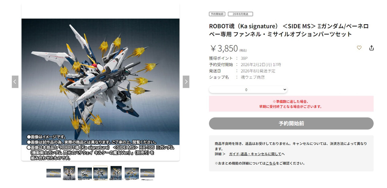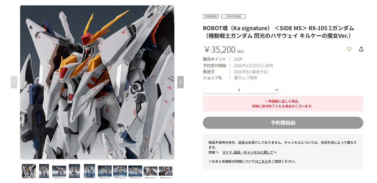 日本PREMIUM BANDAI「ROBOT魂(Ka signature)<SIDE MS> RX-105 Ξ鋼彈(機動戰士鋼彈 閃光的哈薩威 喀耳刻的魔女Ver.)」與「ROBOT魂(Ka signature)<SIDE MS> Ξ鋼彈/潘妮洛普專用精神感應飛彈配件組」將從2026年2月2日下午開始接受預約,並預計將於2026年8月開始寄送。