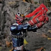 「好!」威吹鬼快步跑來,閃過錯亂童子的前踢,側身並蹲低身體,將爆裂音擊鼓押在錯亂童子腹上,「噫!」