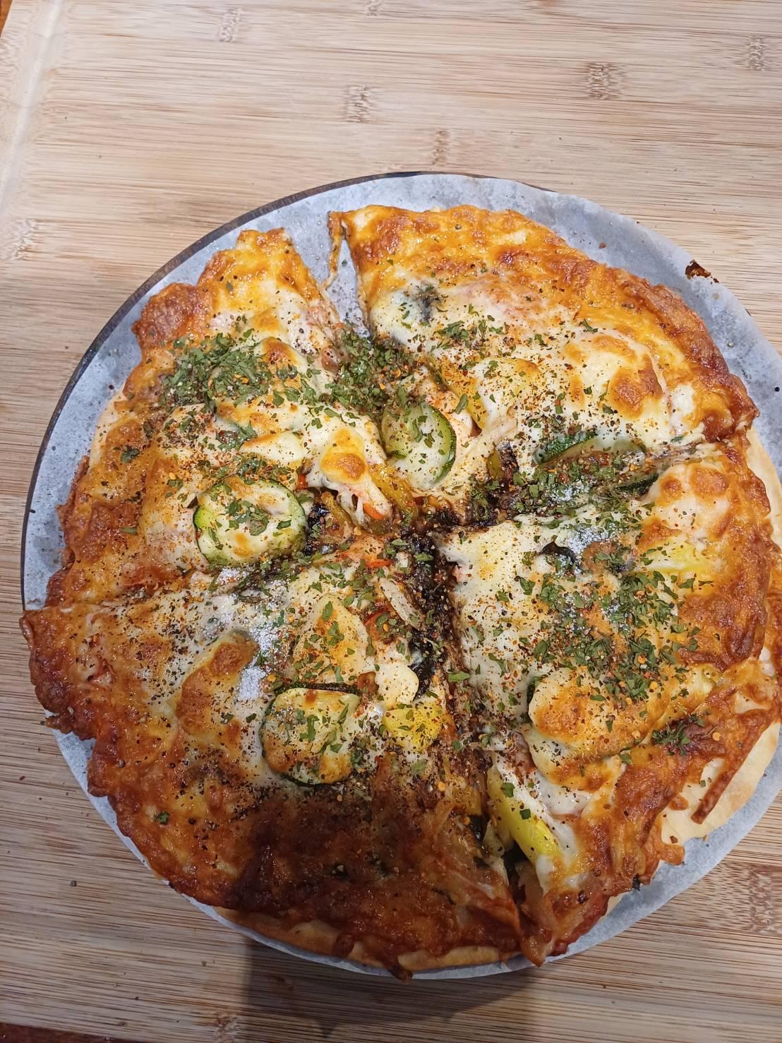 在內湖的覺旅咖啡,就這次的披薩呈現上也較上次更好,且外層的金黃酥脆感在這次確實能看的出來且明顯。烘烤的方式這次在烤箱下層烤個四到五分鐘,再移到上層去烤個五分鐘,出爐後在切成四片,移出鐵盤拿到木盤去做裝盛,最後食用。