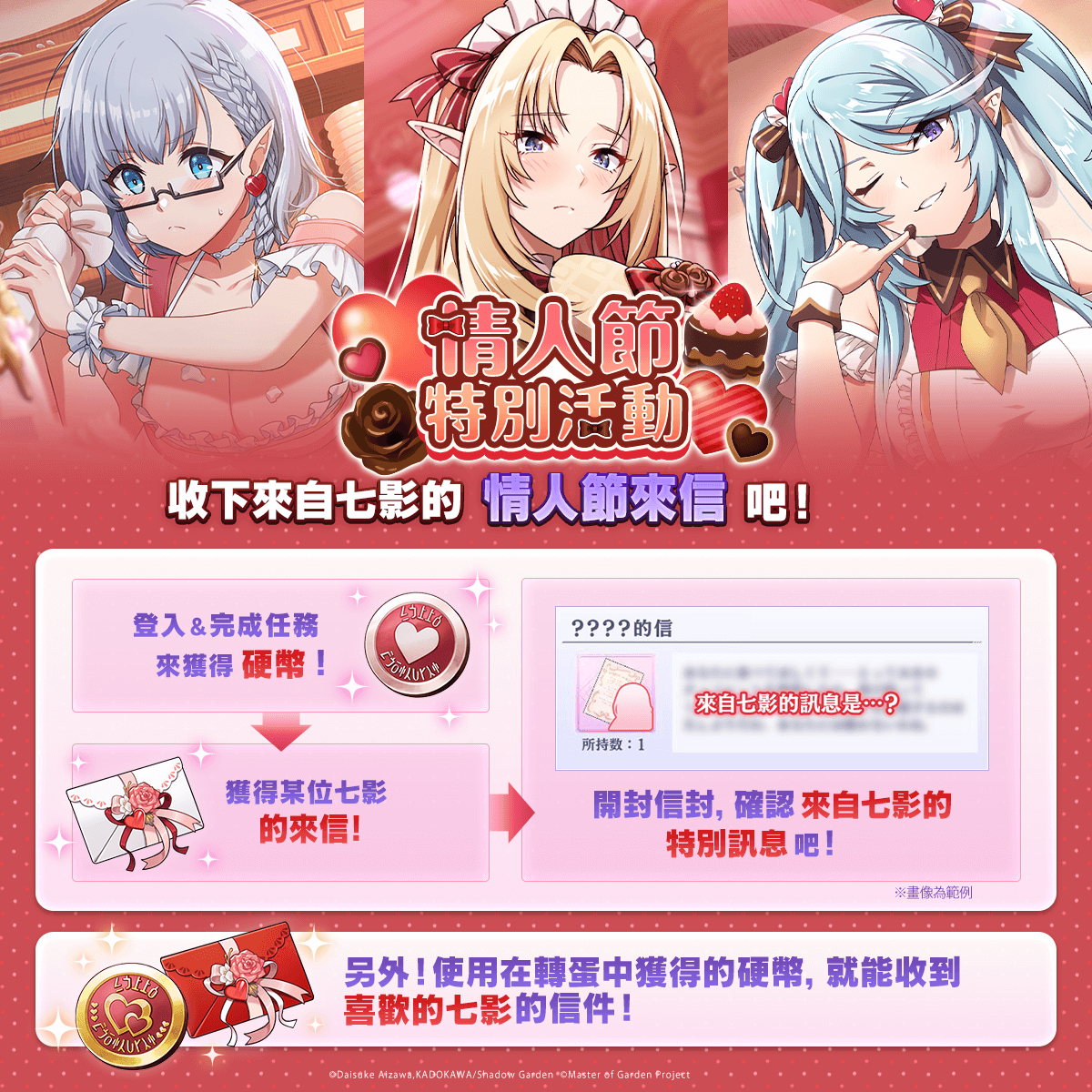 為紀念情人節實施特別活動,透過登入獎勵與任務即可獲得情人節硬幣,可於四越分店兌換來自某位七影的信、幻魔石等豪華獎勵,開啟信封後將能收到來自某位七影的信,活動期間內抽取指定轉蛋即可獲得情人節 SP 硬幣,可於四越分店選擇並兌換來自喜愛的七影來信。