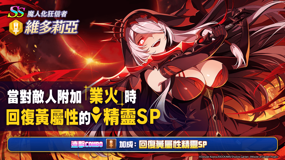 自 12 日起舉辦的闇影慶典轉蛋【魔人化狂信者】維多莉亞,是名當對敵人附加「業火」時回復黃屬性精靈 SP 的黃屬性輸出角色,搭配專屬魔道具「憎愛之劍」,於闇影慶典轉蛋中 SS 角色出現率提升為 4.5 %。