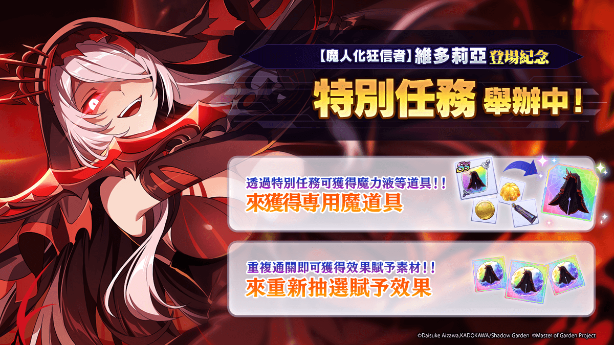 為紀念闇影慶典轉蛋【魔人化狂信者】維多莉亞 登場實施特別任務,完成任務可獲得相關培育素材。
