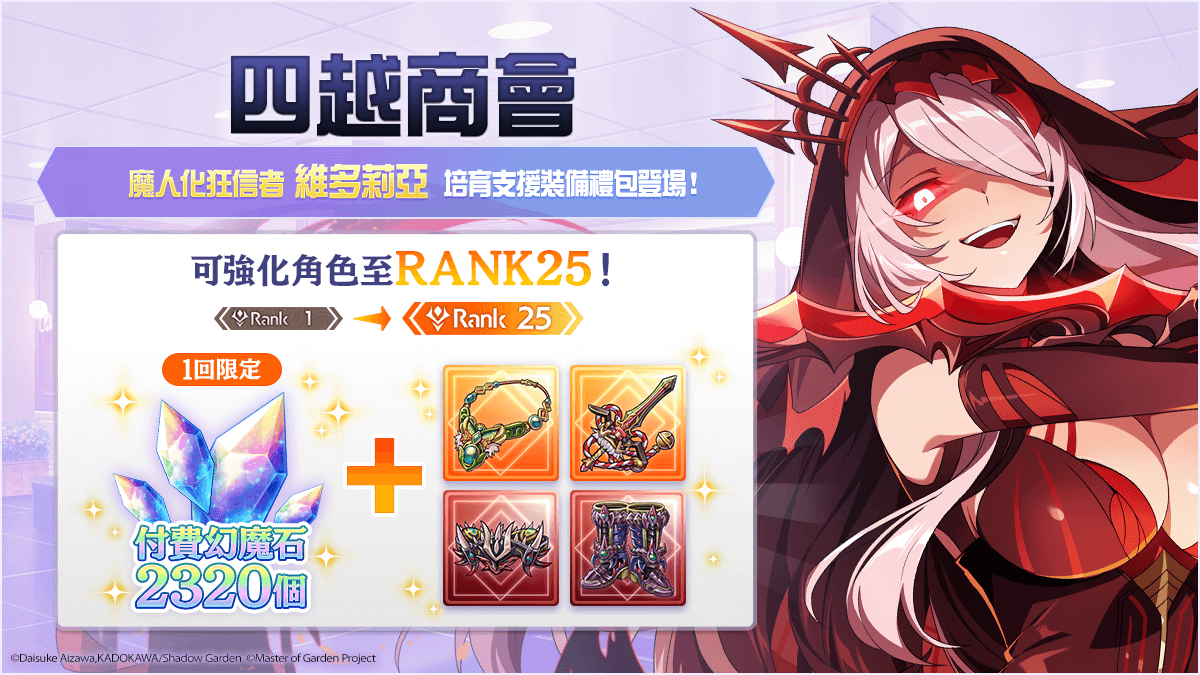 於四越商會內新增闇影慶典轉蛋【魔人化狂信者】維多莉亞 培育支援裝備禮包,內容包含了 可強化角色至 RANK 25 的裝備 以及 付費幻魔時 2320 個。