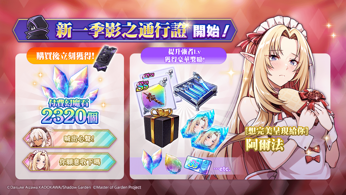 作為新一季影之通行證,購買本季的豪華通行證可獲得【嚴厲的甜點師】拉姆達 和【想完美呈現給你】阿爾法 特別稱號,豪華獎勵還會出現【想完美呈現給你】阿爾法 與影之通行證箱子。