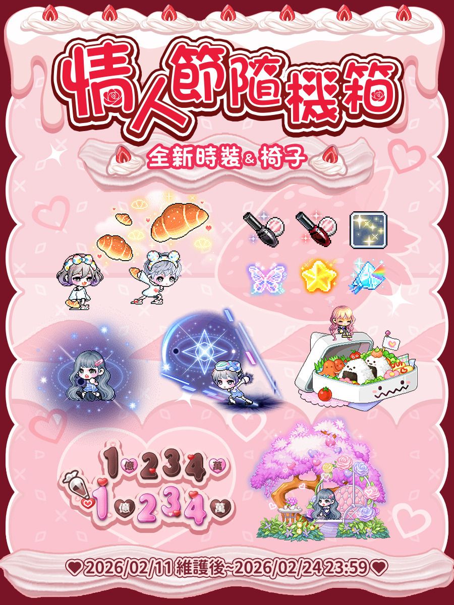 ・本文整理【新楓之谷 MapleStory】2026 情人節隨機箱內容,包含情人節時裝、武器、特效與椅子外觀展示(節選),供玩家查詢與搭配參考。