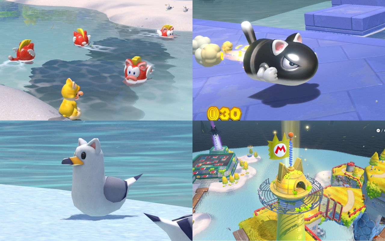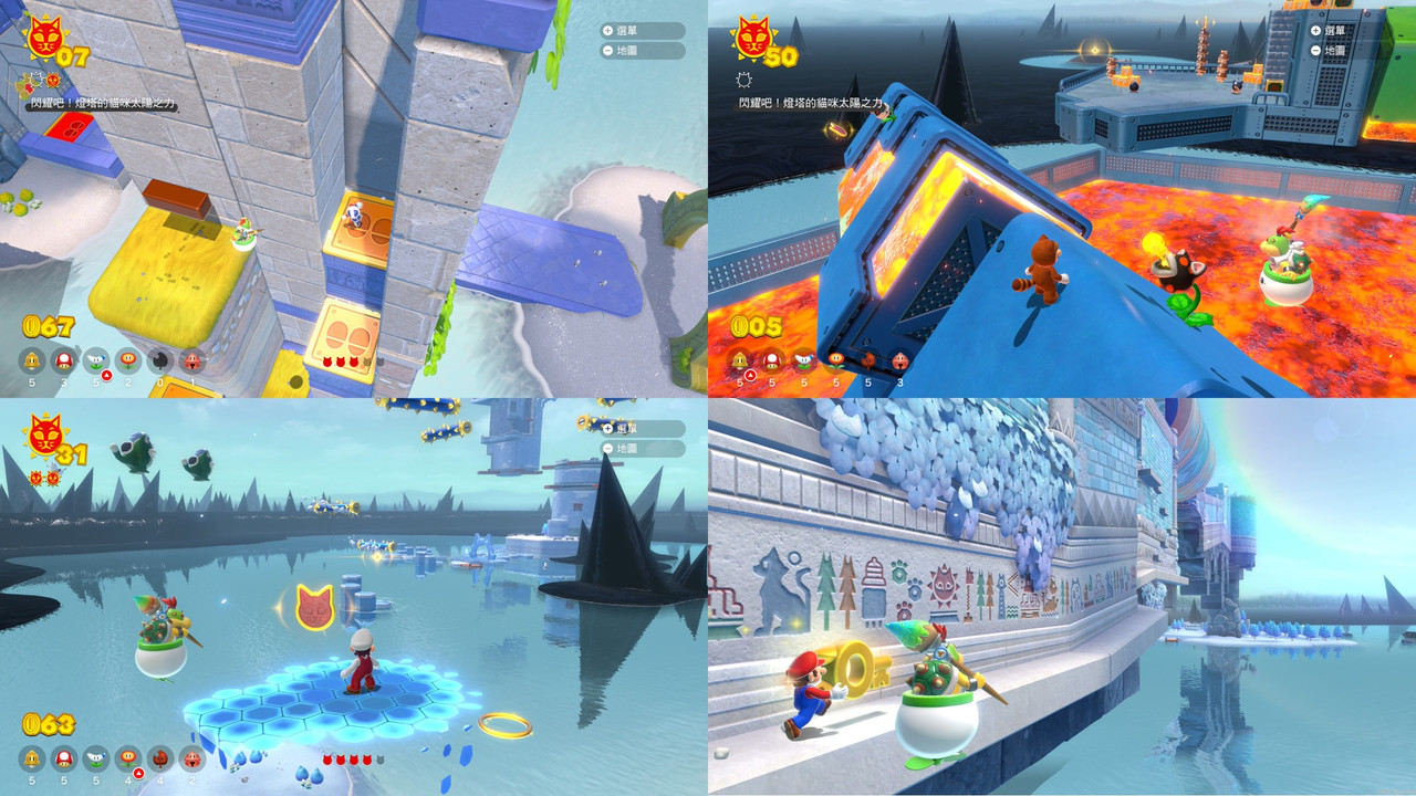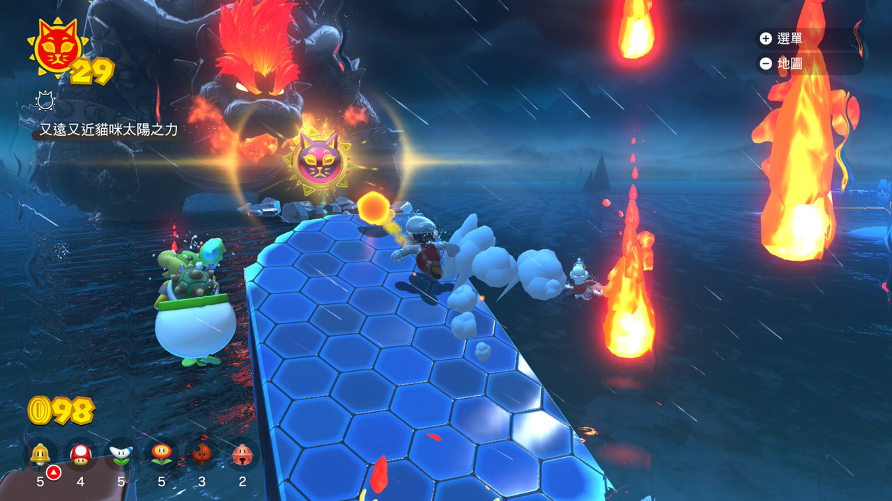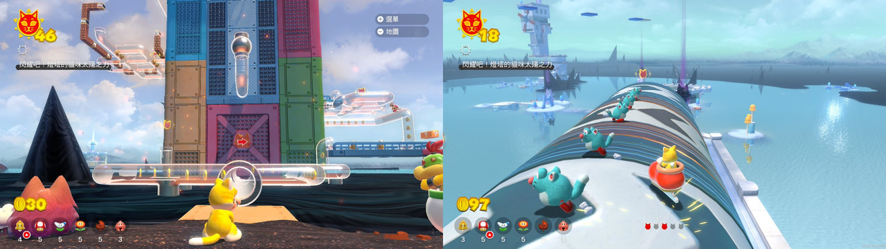 連瑪利歐與庫巴,都是以貓咪型態對戰;瑪利歐會變成超級賽亞貓。
