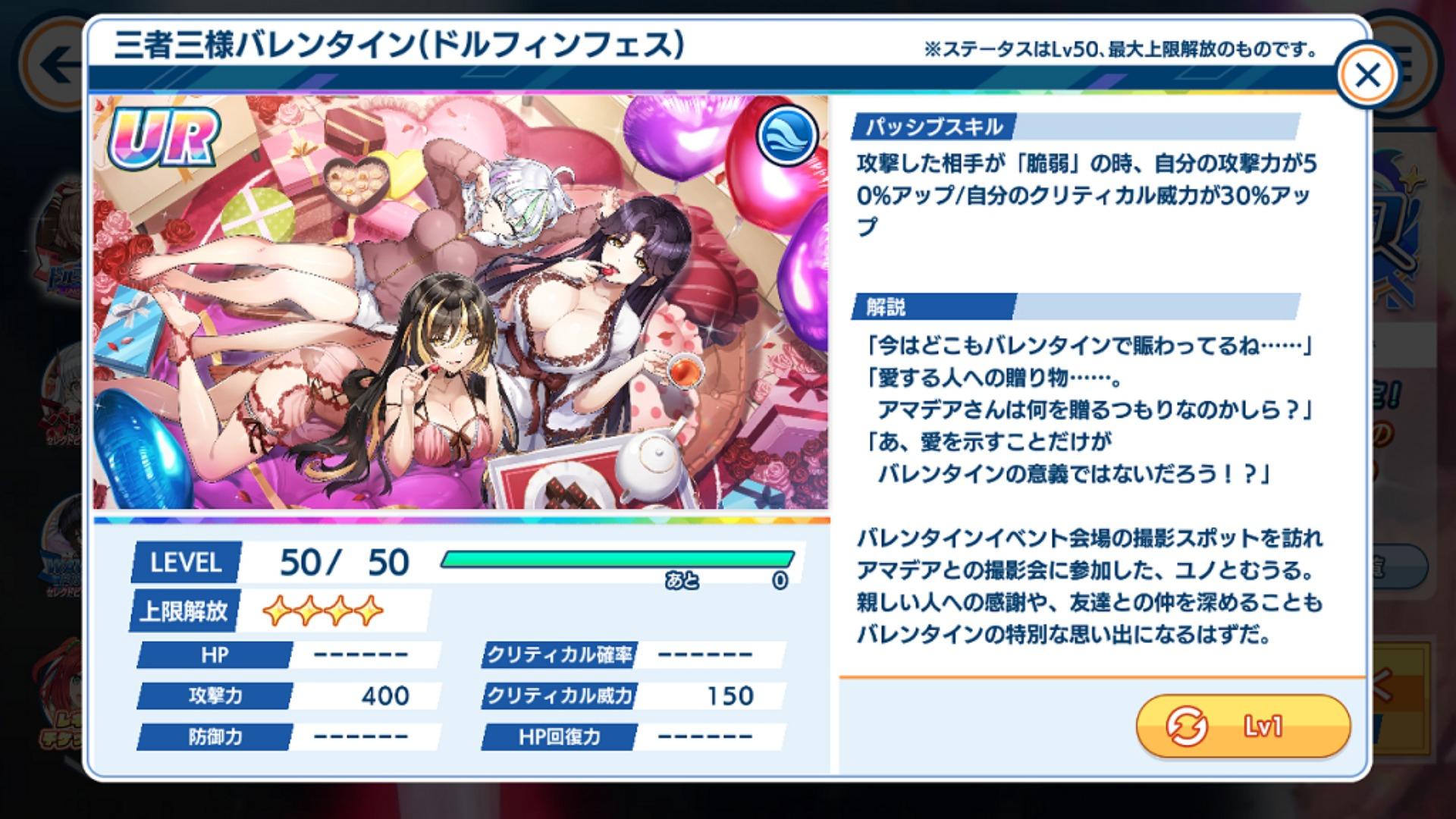 本次 PU 的情人節新回憶則為 UR 情人節因人而異(海豚祭) (三者三様バレンタイン(ドルフィンフェス)) ,對應 Live2D 演出。
