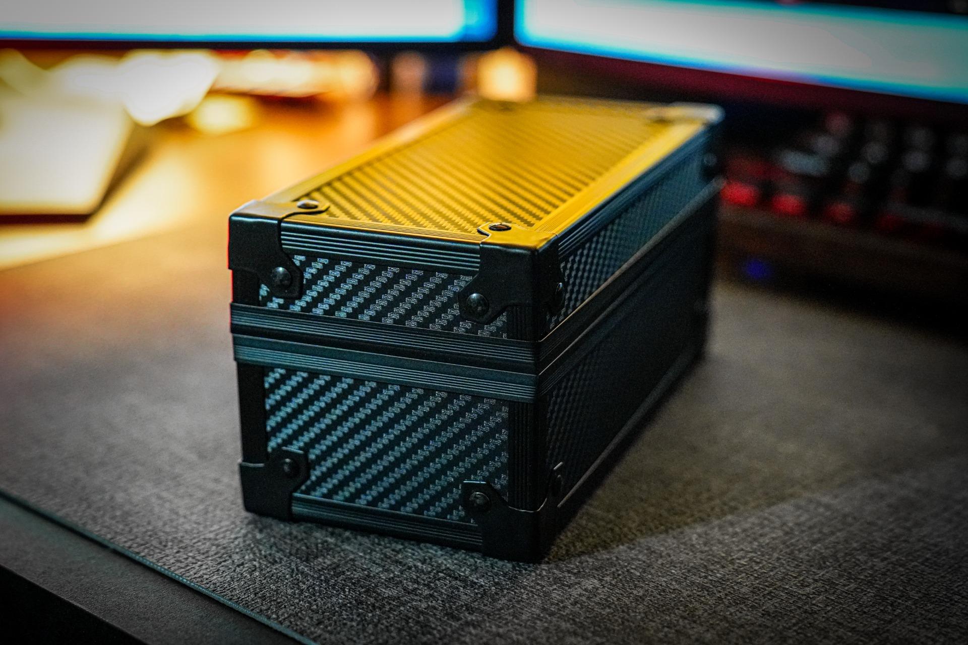 本次內盒也不是紙盒形式,升級成了碳纖維壓紋的防撞箱