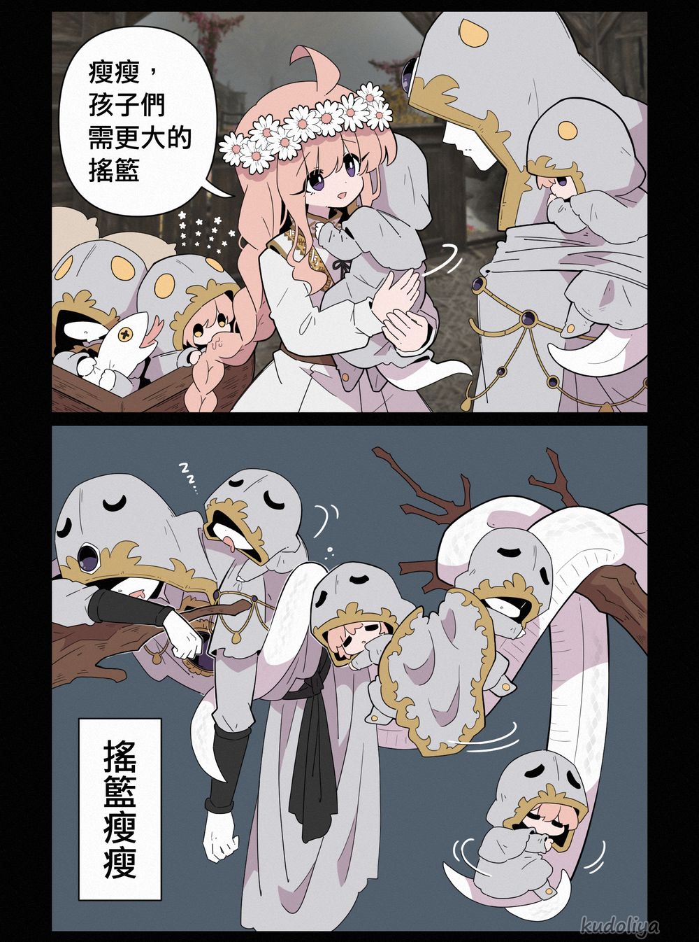 那條曾經是罪惡象徵的鱗片蛇尾巴,現在則成了孩子們的搖籃。