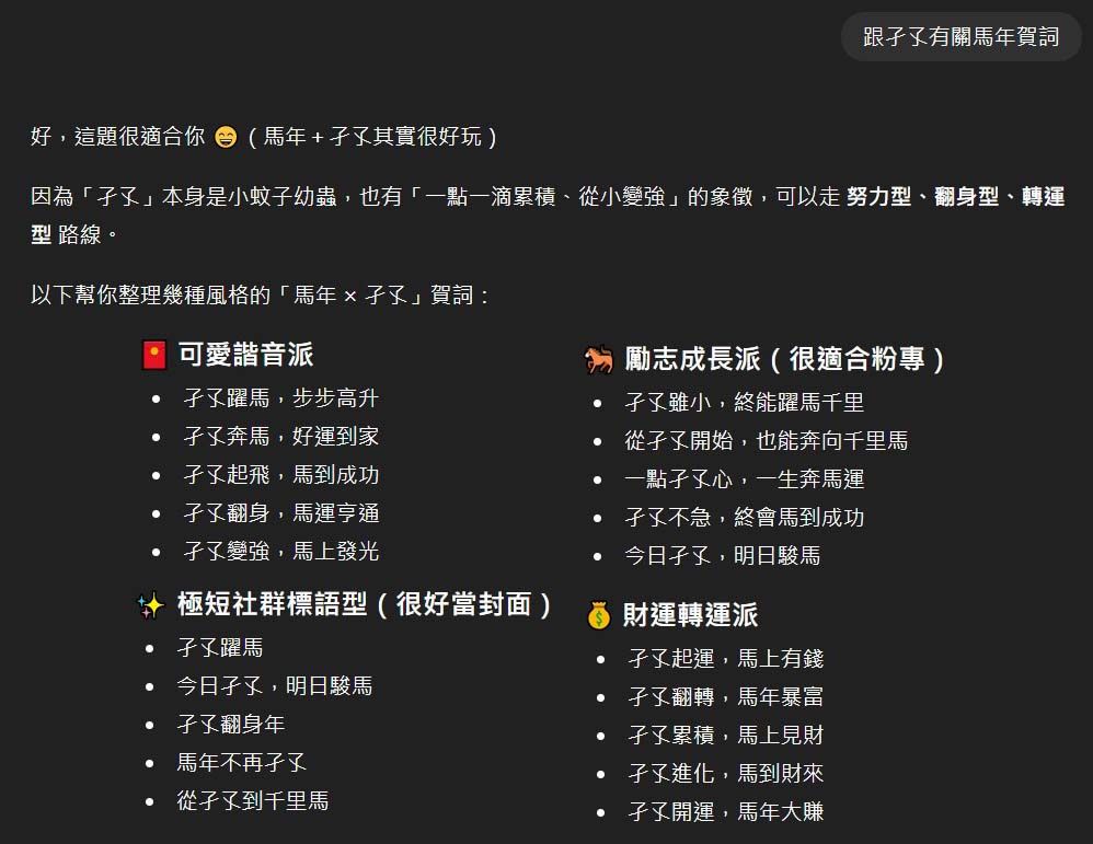 突發奇想在CHATGPT上搜跟孑孓有關的馬年賀詞