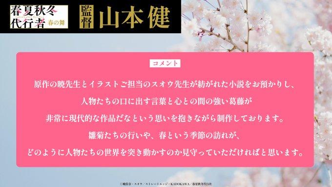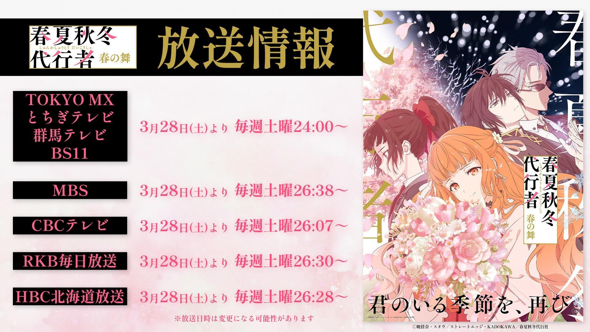 由曉佳奈所著、スオウ繪製插畫的輕小說作品《春夏秋冬代行者 春之舞》,日前宣布改編電視動畫的消息,官方在19日釋出主視覺圖、主宣傳影片與主題曲等情報,預計2026年3月28日開播。