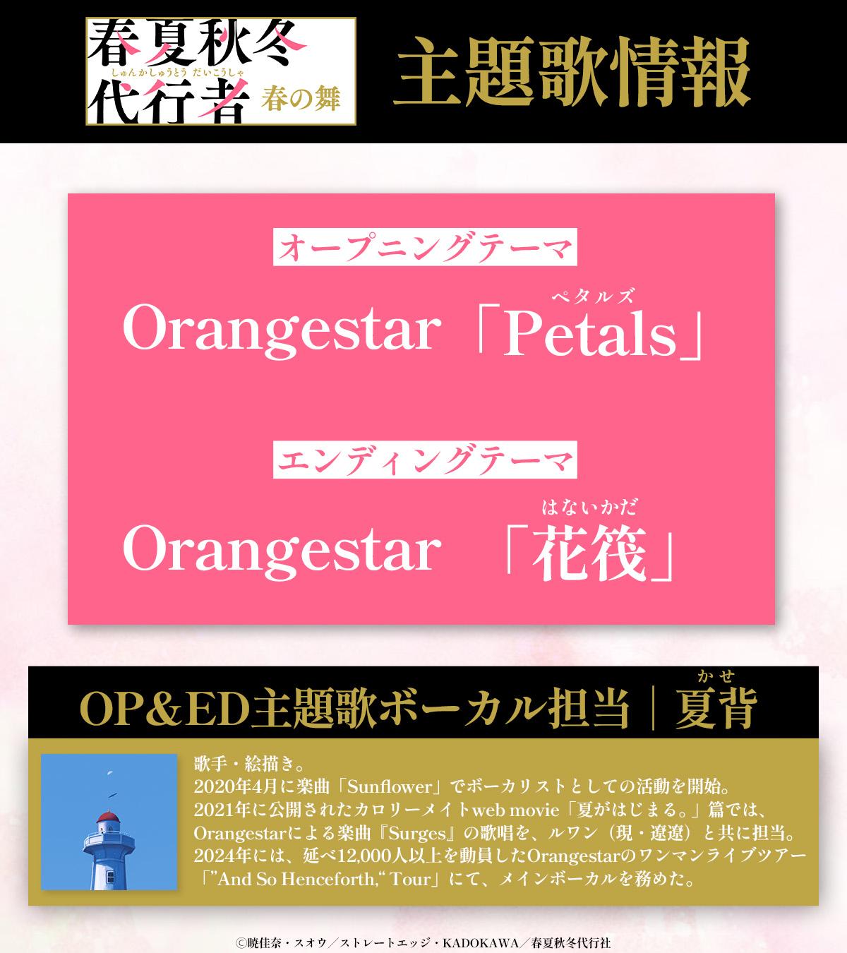 片頭曲「Petals」與片尾曲「花筏」由Orangestar負責樂曲提供,夏背負責演唱。