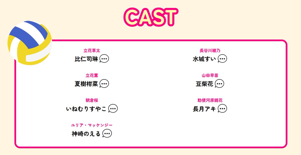 主演聲優分面,分別由 比仁司琳 飾演 立花草太、水城すい 飾演 長谷川綾乃、夏樹柑菜 飾演 立花薫、豆柴花 飾演 山田早苗、いねむりすやこ 飾演 朝倉桜、長月アキ 飾演 勅使河原鏡花、神崎のえる 則是飾演 ユリア・マッケンジー。