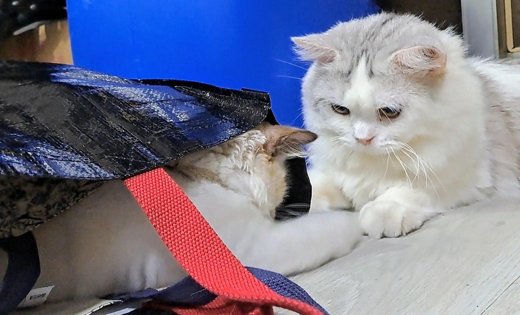 貓妹成功逃脫。她因為太亢奮干擾放飯,又被家長放入圓形貓籠。圓形貓籠嗎? 有意思的挑戰。