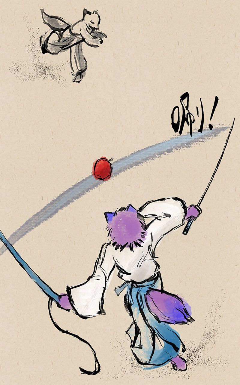 其中他拔刀切蘋果,卻揮棒落空的場面,也對應著第五話。這麼多年來他真是一點進步也沒有XD。