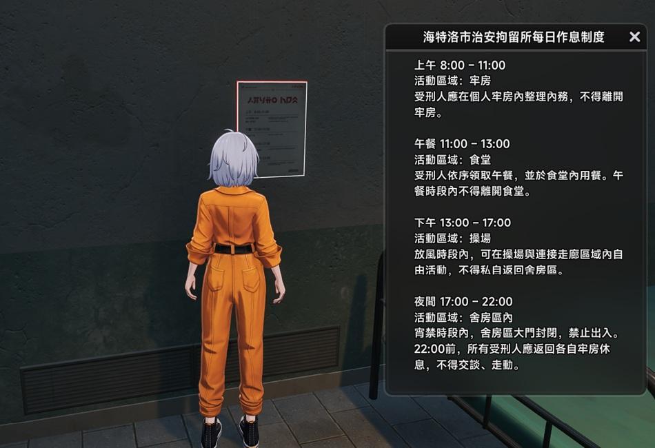 監獄內部一日作息表與部分實機畫面展示。