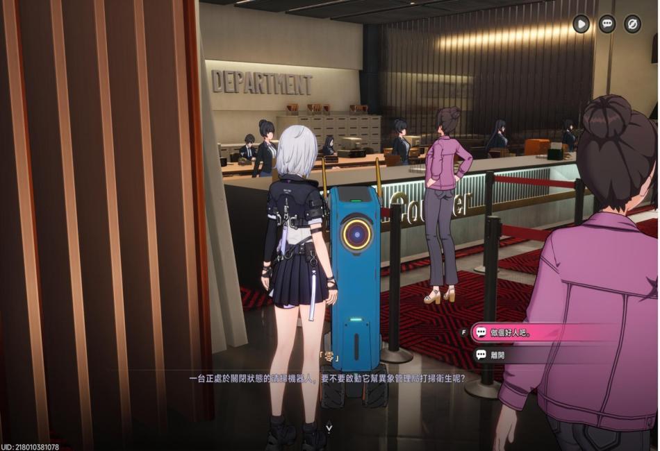說明:在大廳櫃台左側待命中(?),選擇"做個好人吧。"便會行動至指定地點並開始"頭槌攻擊Loop共32次",之後三台機器人會來到大廳櫃檯前方,兩台會互相開始繼續"頭槌攻擊Loop..."一台在旁邊"勸架"。