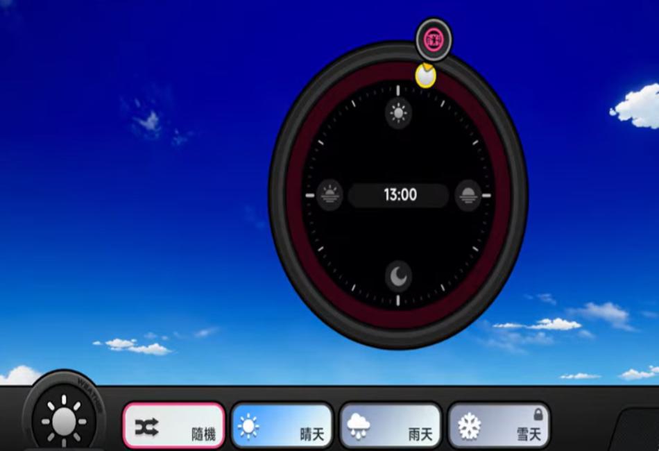 說明:可自由切換到白晝、黃昏、夜晚、深夜共四個時段,並可選擇晴天、雨天、雪天天氣變化。