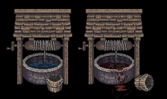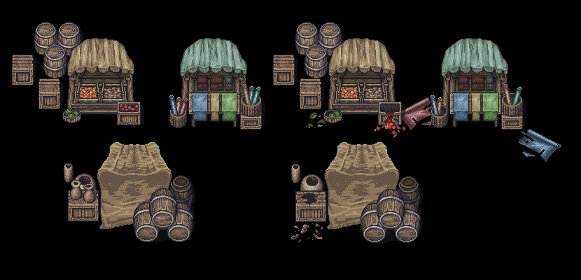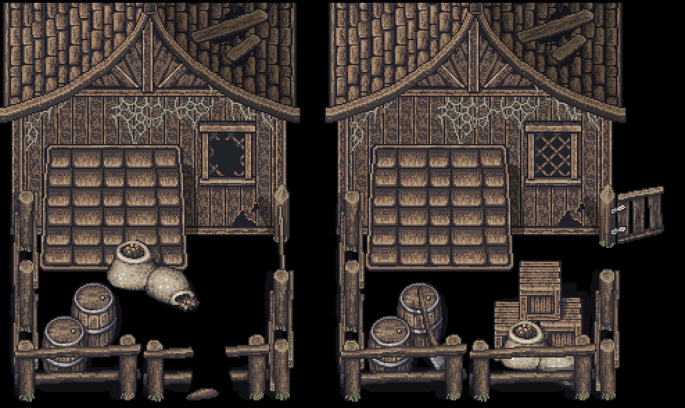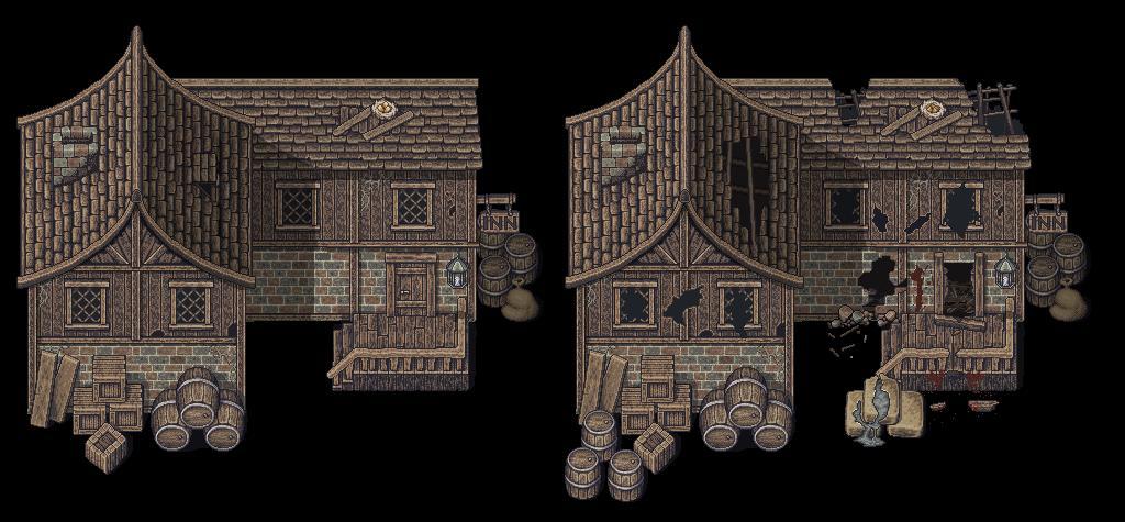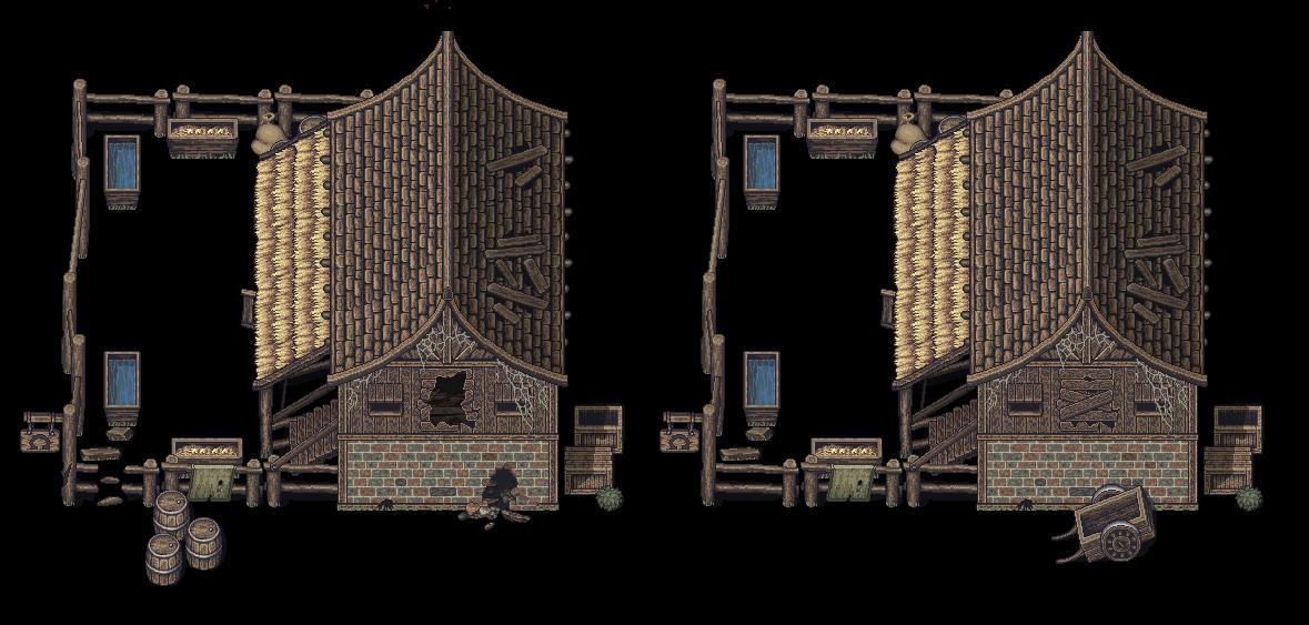 場景上分別繪製了許多可以重複使用的物件,為了凸顯出變化性,我嘗試製作了兩種不同階段的設計。