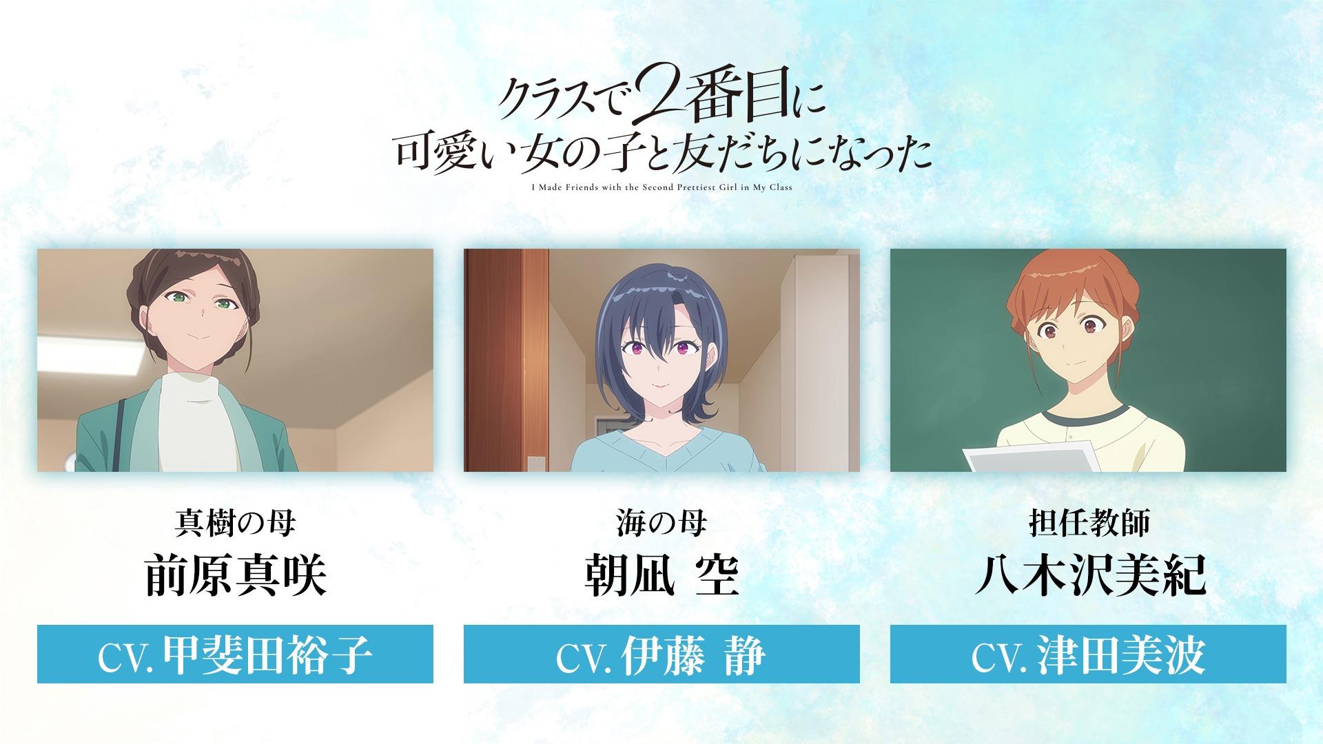 改編自 たかた 所著、日向あずり繪製插畫、預計自 2026 年開始播映的電視動畫《我和班上第二可愛的女生成為朋友》。官方就在 1日這天正式告知動畫將自 2026 年 4 月7日起開始播映,並釋出動畫的新視覺圖、第二支宣傳影片以及片題曲與追加聲優名單等情報。 本作故事描述,連點頭之交都沒幾個的我──前原真樹交到了第一個朋友朝凪海。男生們都說朝凪同學是「班上第二可愛」,而且很照顧天真爛漫的 No.1 美少女天海同學。這樣的她只有在週五的放學後,會偷偷來我家玩。從平常能幹的模樣,實在難以想像私底下的她這麼率直又愛撒嬌。這是低調男與第二女主角之間的真實「朋友」戀愛喜劇。