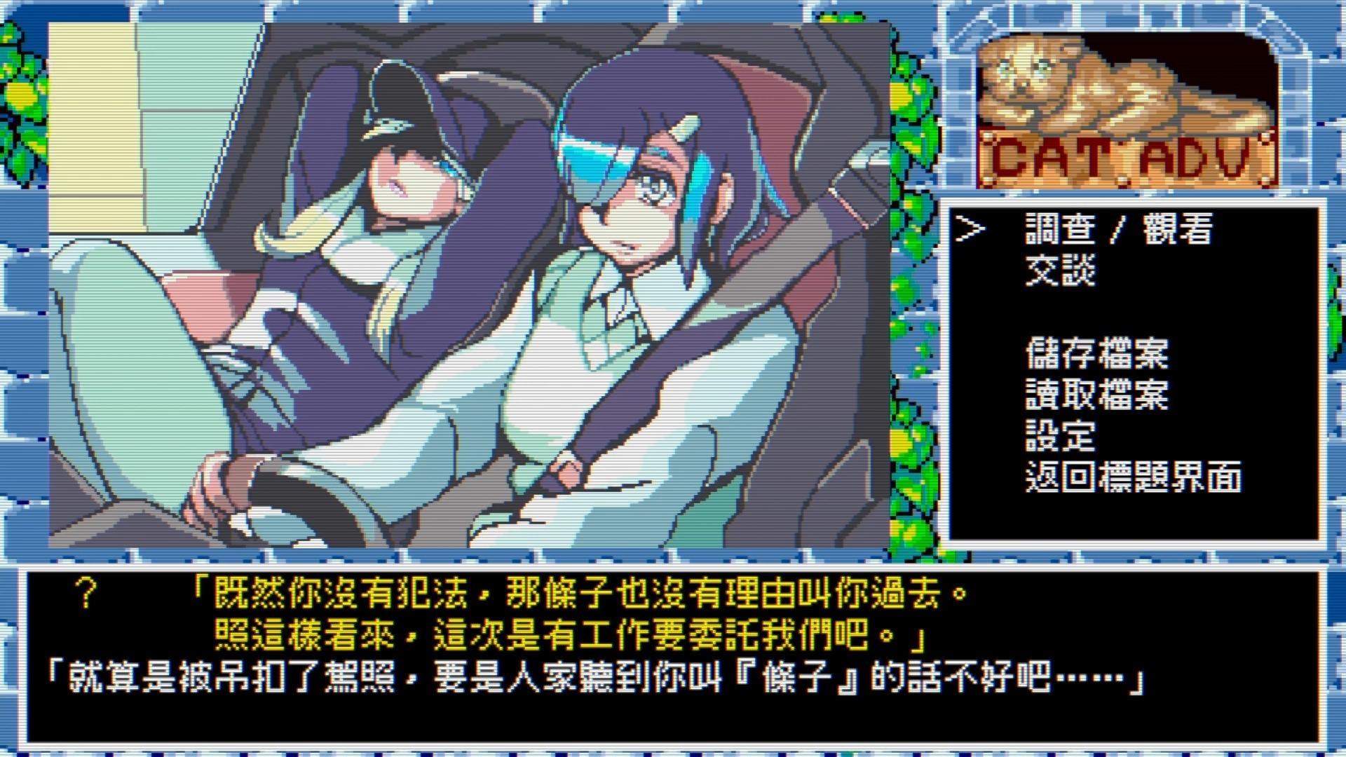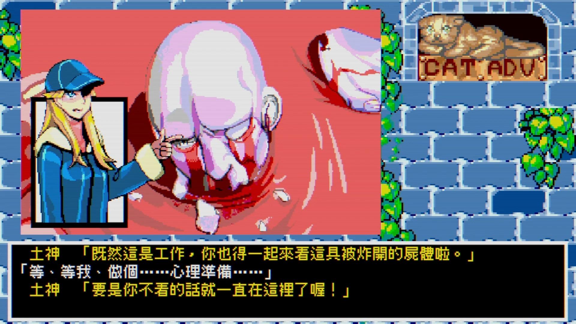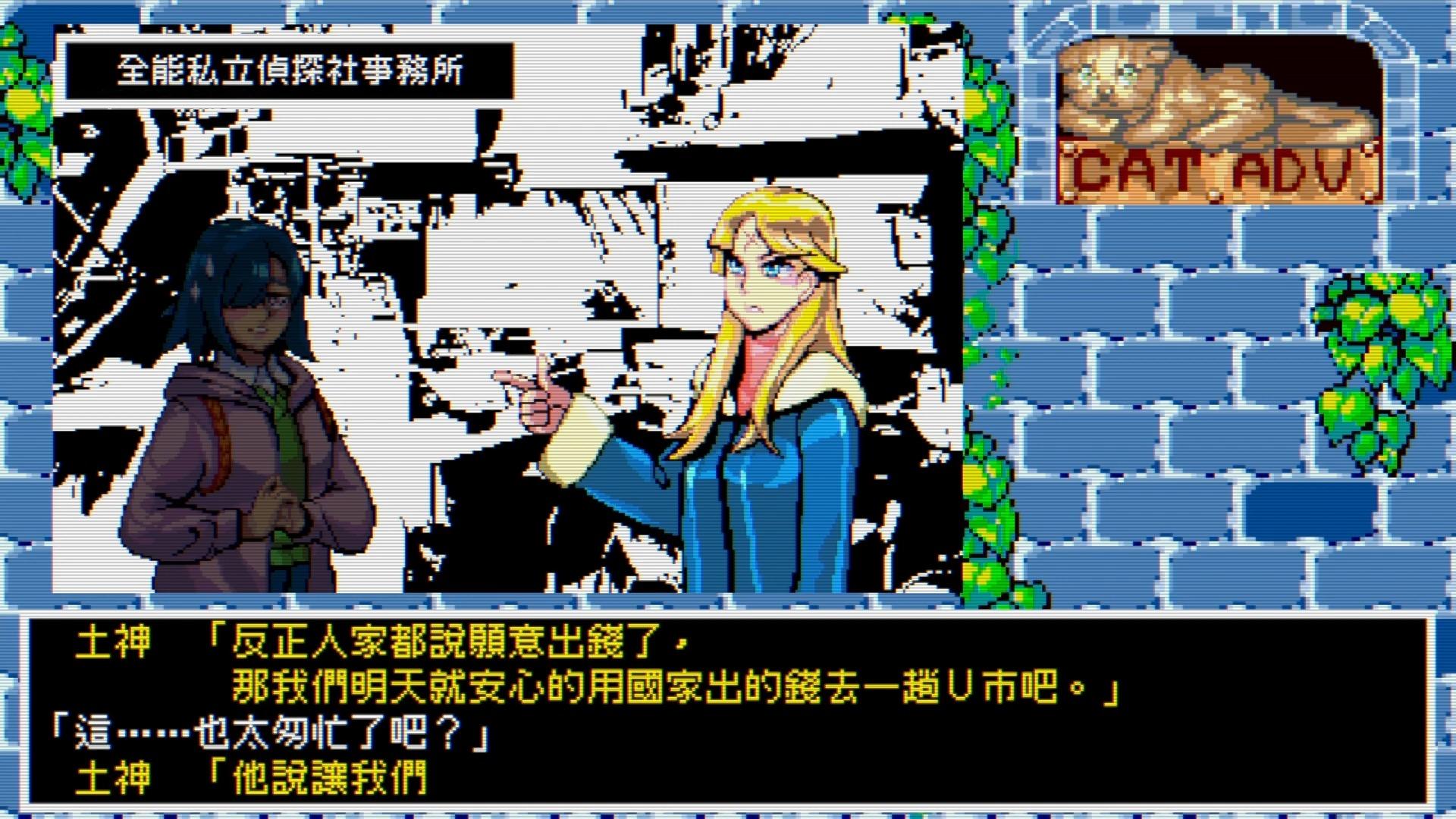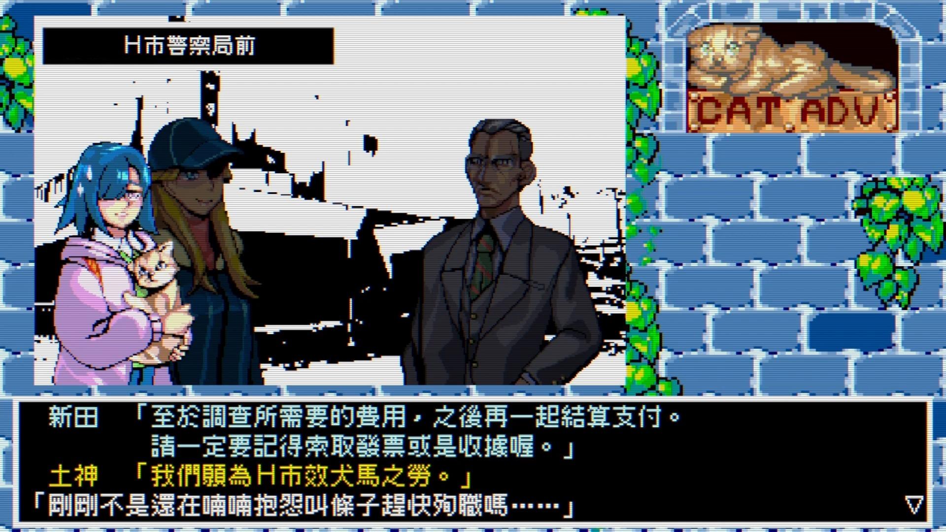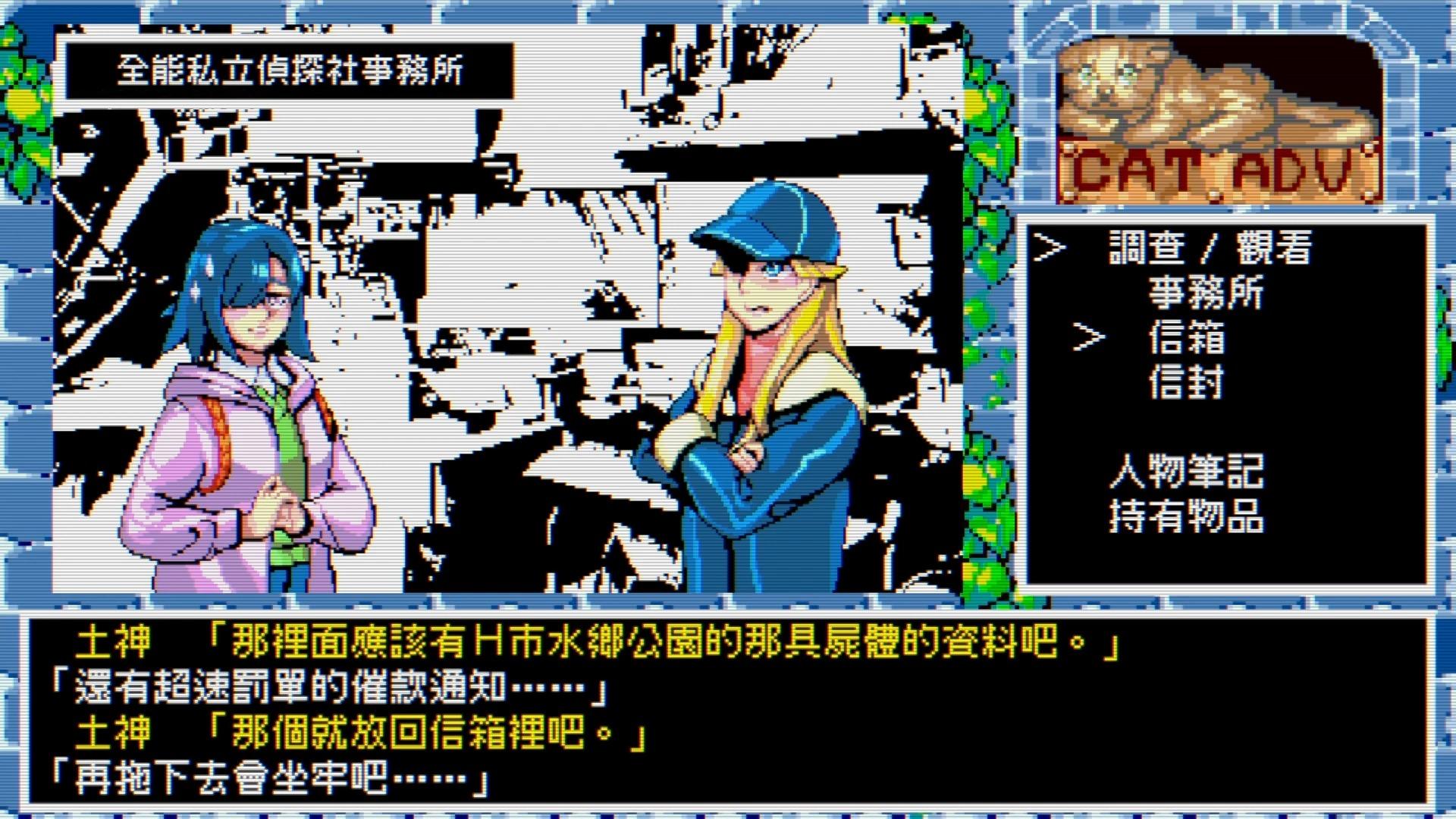 透過觀察、調查、交談等指令推進劇情,不只是玩法像《逆轉裁判》,連文本敘事地風格也跟《逆轉裁判》一樣搞笑XD,其中一個女主角土神對警察恨之入骨的原因是因為警察開了他罰單,然後接受警察的委託後還說要安心的國家的錢搭飛機XD