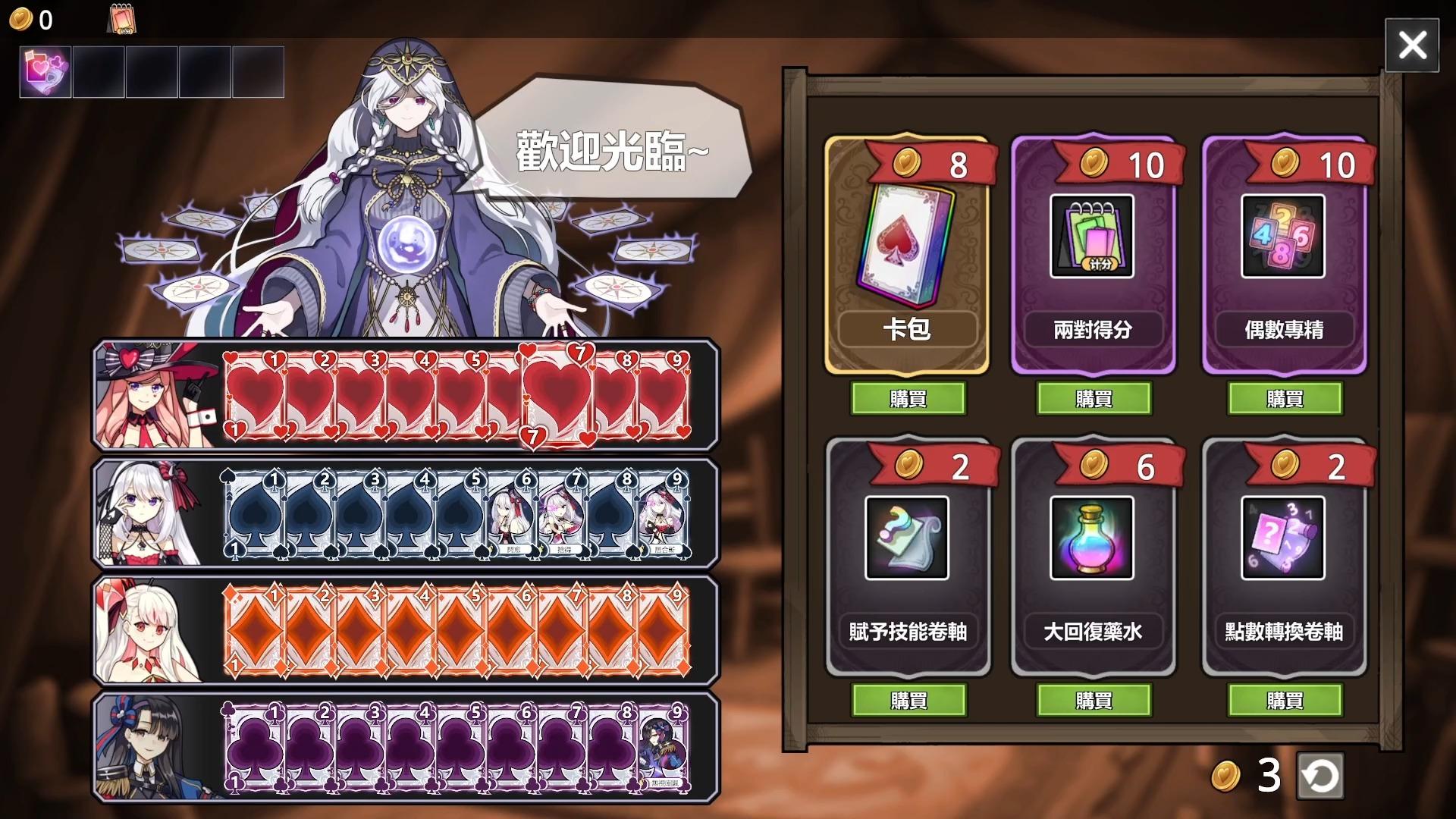 目前體驗版只開了一個角色,但看起來未來四種角色應該都會用4種花色的撲克牌來組成牌組吧?那這四個角色怎麼發展出各自的特色牌組?而且開發團隊還不是給整副牌,就只給了4種花色1~9,Why?For What?這麼少的牌要怎麼打出協同效應,耐玩度上無法想像。