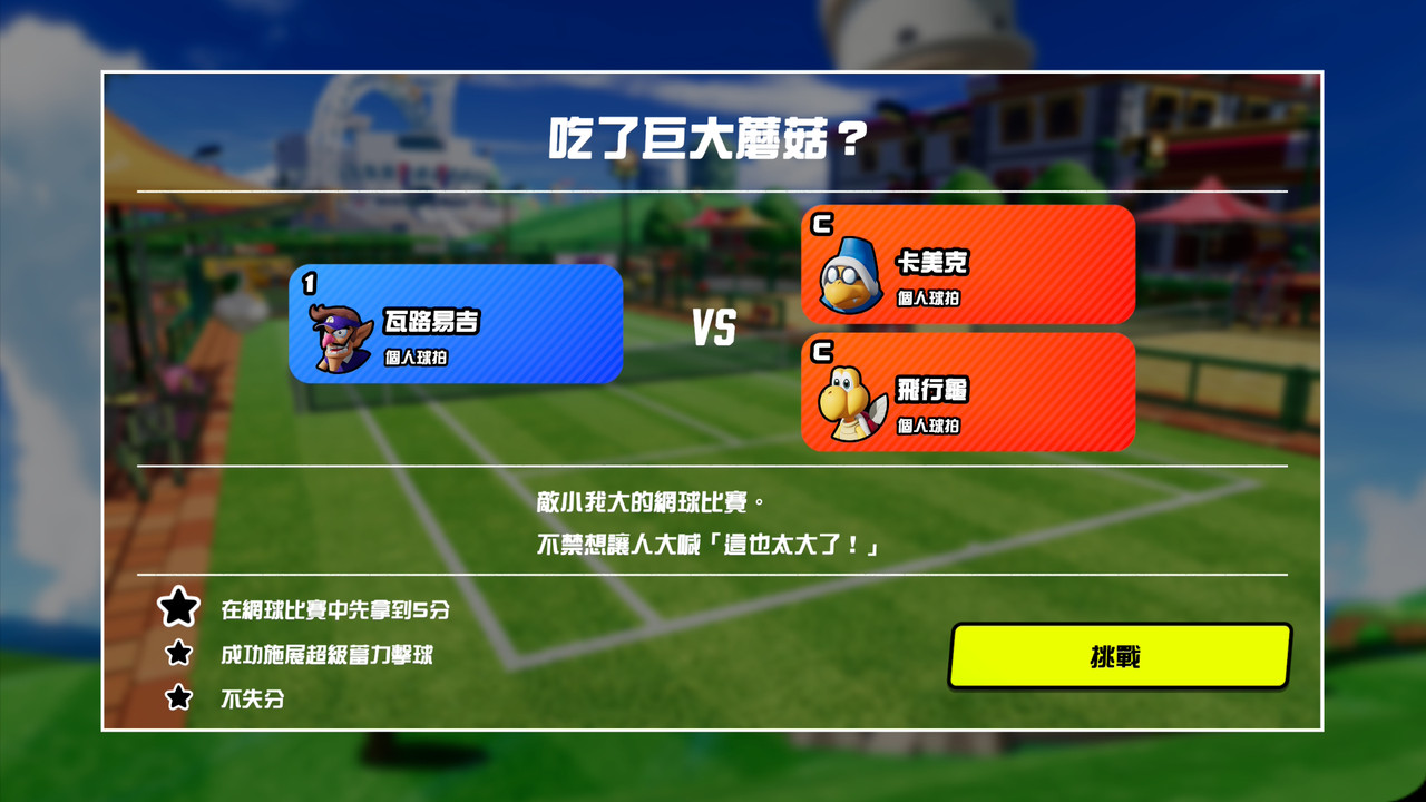 爬塔和集星模式,採用任務式的關卡玩法,我覺得是本作中的一大亮點。三個難度的爬塔,各有十關,給定角色、球拍與球場,再套上各種規則或前置條件的網球對戰,例如:一對二的劣勢戰、成功反擊N次對手的球、在持續火燒的場地贏球等等。集星則是除了完成比賽外,還得達成不失分、不飛身救球、使出蓄力擊球等條件,才能以三星成績通關,一共一百關。