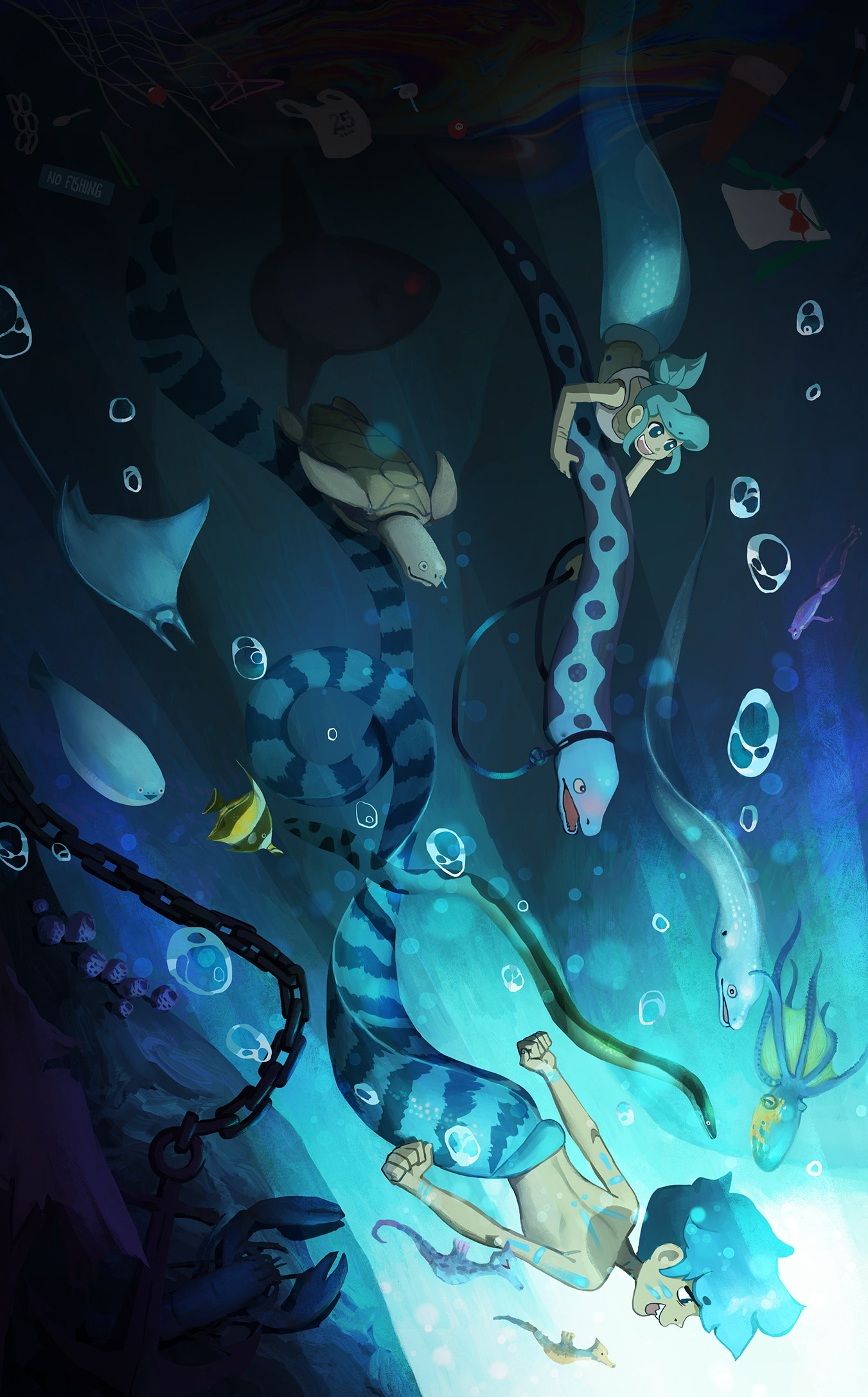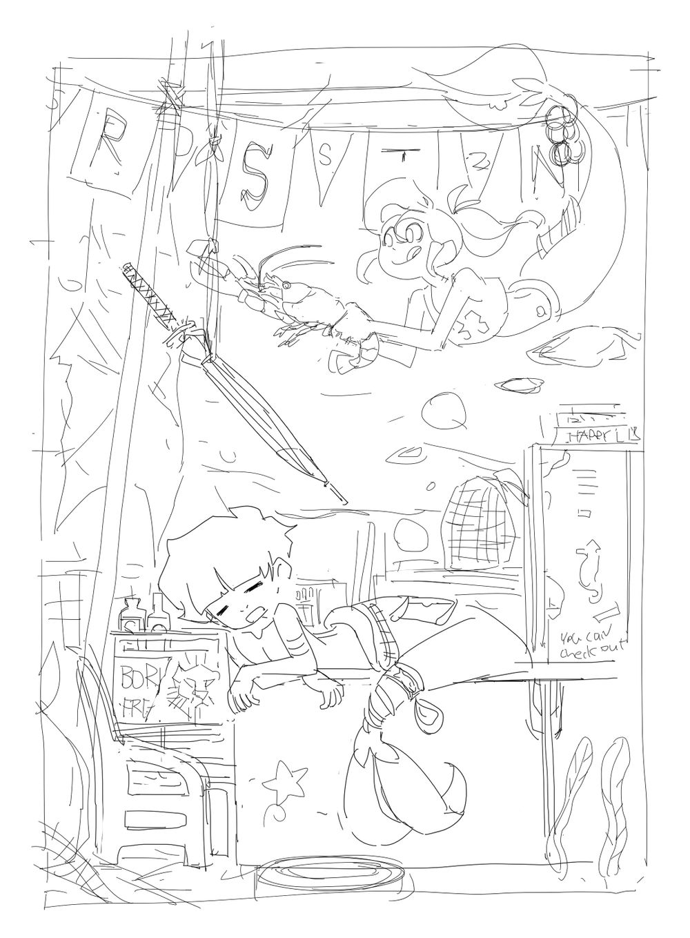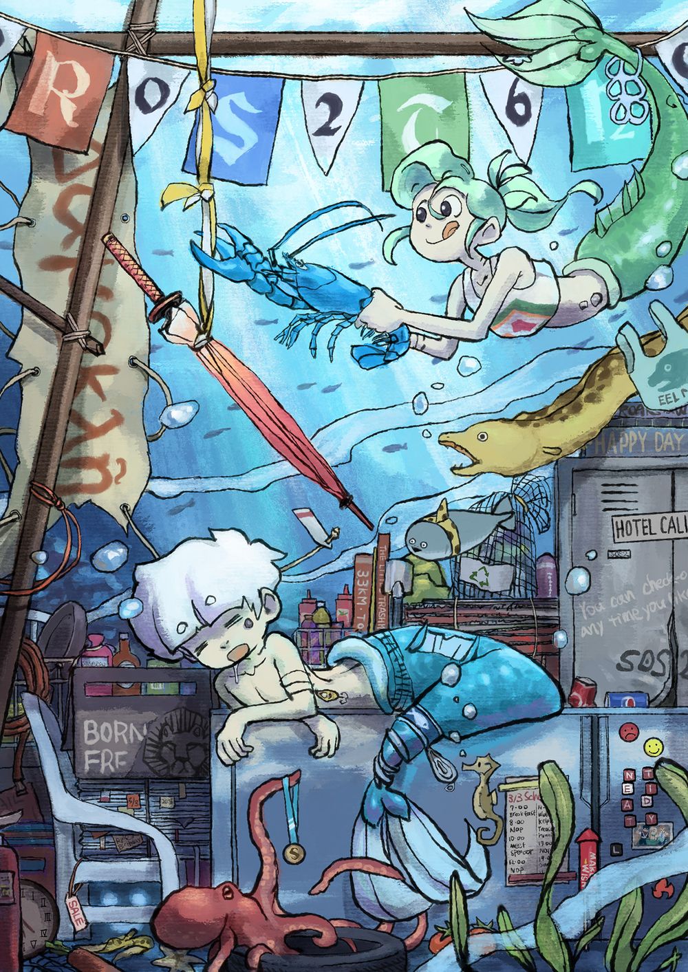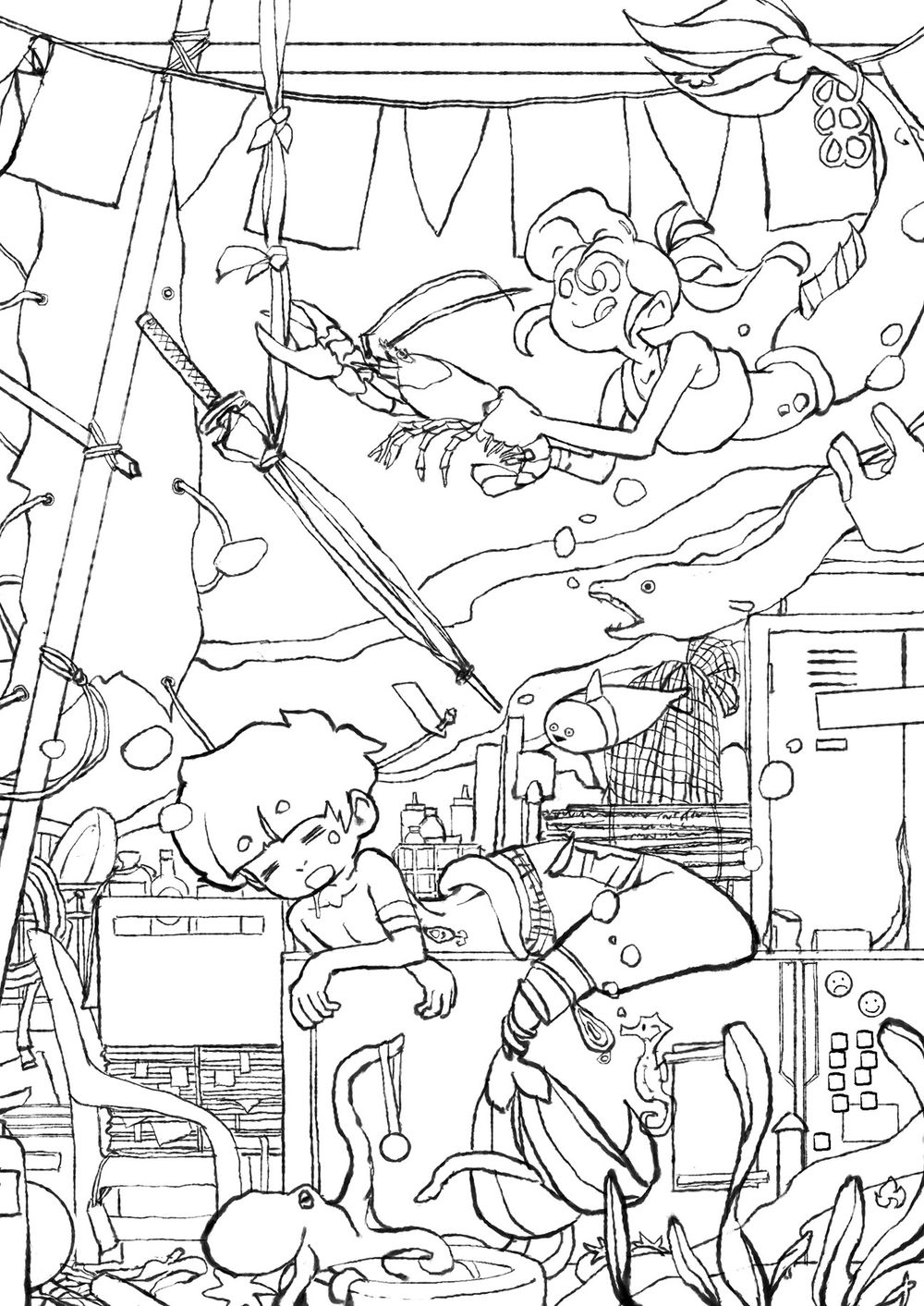 一開始我只是想畫人魚男孩Neptaan趴在海底的舊沙發上打盹,然後Tidy在一旁打算惡作劇鬧他一下。至於要怎麼鬧並沒有想法。