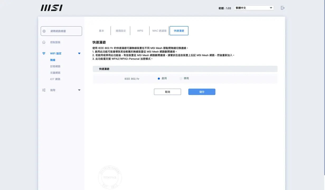確保無縫漫遊不掉線的功臣!在「快速漫遊」選單中,記得確認 IEEE 802.11r 處於「啟用」狀態。它能讓你的手機在不同樓層的 Mesh 節點間切換時,達到近乎「零等待」的無縫銜接。